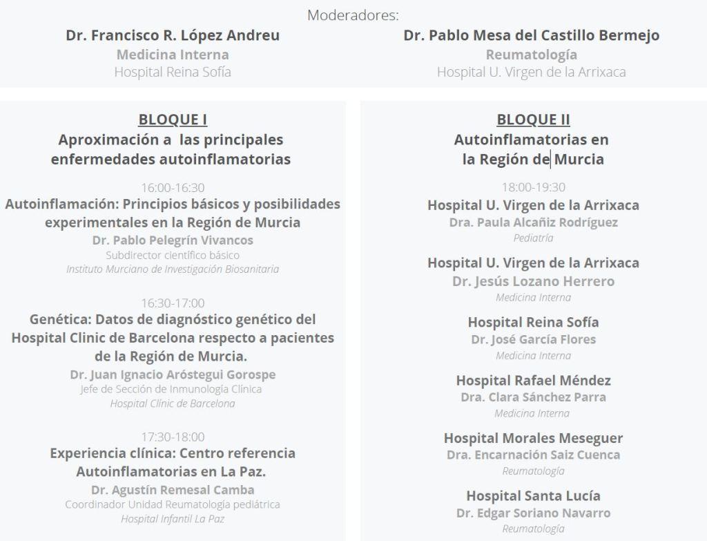 Contaremos con la participación de la Dra. Ana Noblejas Mozo, de la Unidad de Enfermedades Autoinmunes del Servicio de Medicina Interna del Hospital Universitario La Paz de Madrid, quien nos hablará de la granulomatosis eosinofílica con poliangeítis con ciertas cuestiones a resolver en la práctica clínica. Y también nos acompañará el Dr. José Luis Callejas Rubio, de la Unidad de Enfermedades Autoinmunes del Hospital Universitario San Cecilio de Granada, quien tratará sobre el manejo de la nefritis lúpica. Después, se presentarán casos clínicos problema a discutir con los expertos.