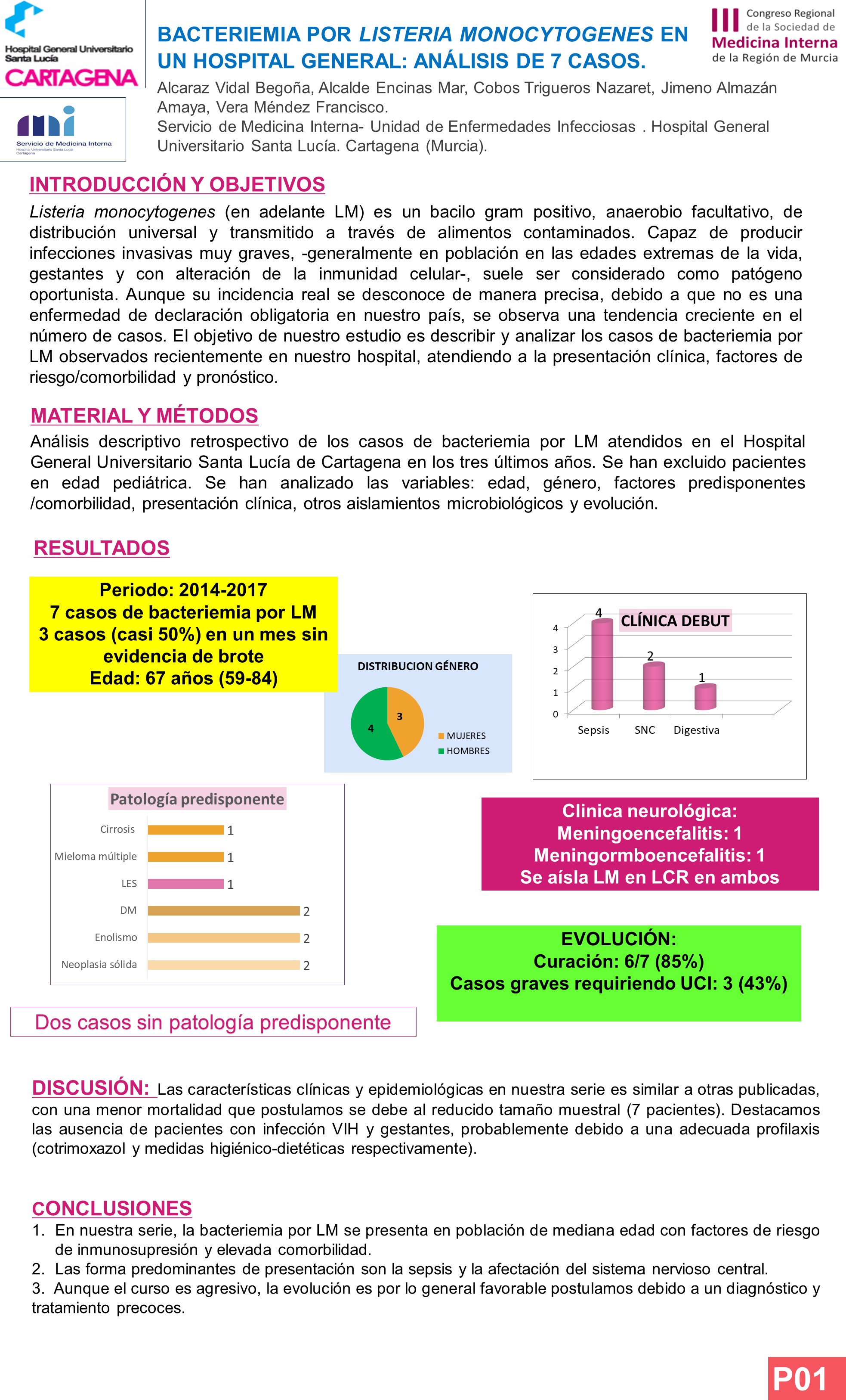 | P01 | Título: Bacteriemia por Listeria monocytogenes en un hospital general: Análisis de 7 casos. Autores: B. Alcaraz Vidal; M. Alcalde Encinas, N. Cobos Trigueros, A. Jimeno Almazán, F. Vera Méndez. |