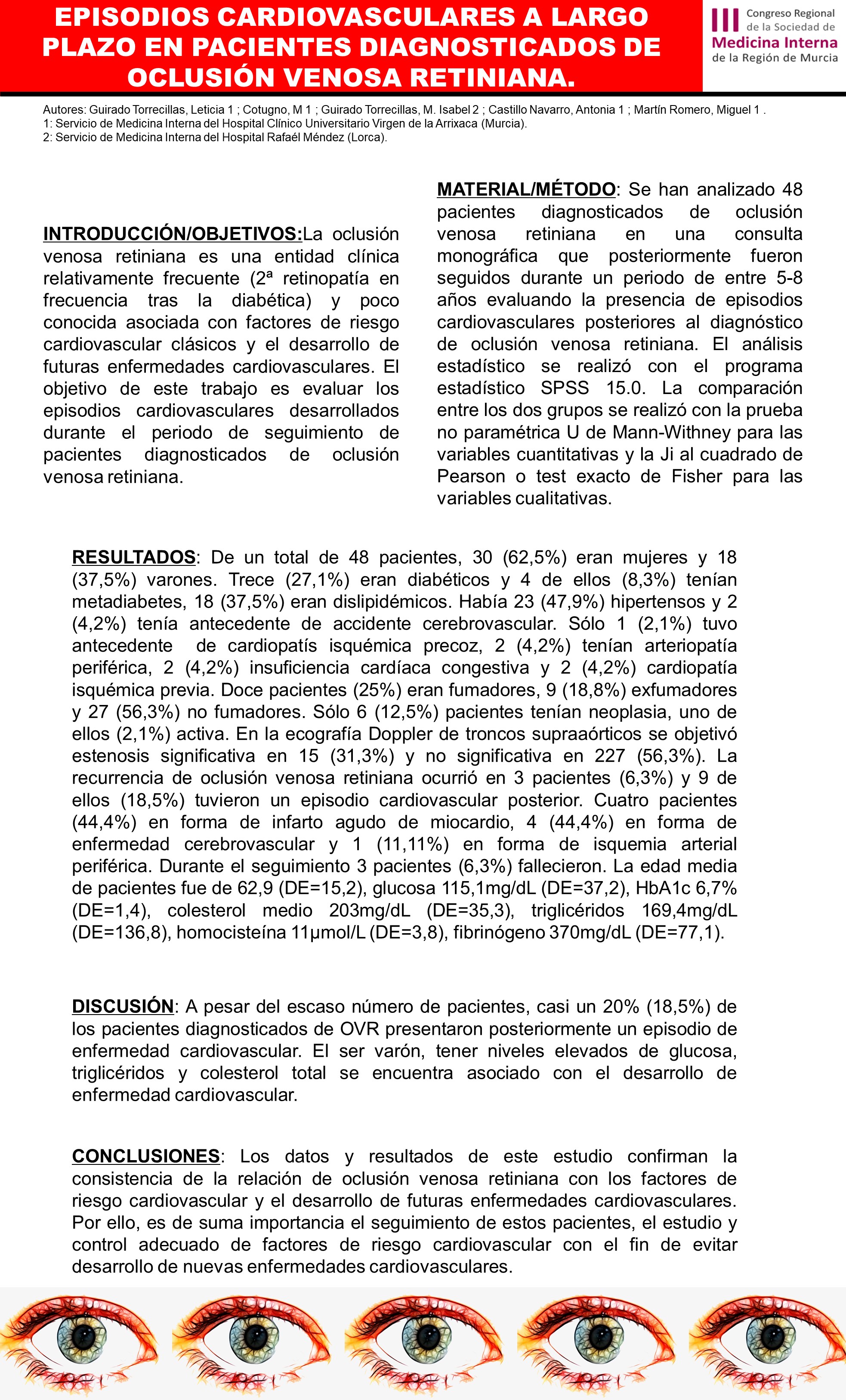 | P02 | Título: Episodios cardiovasculares a largo plazo en pacientes diagnosticados de oclusión venosa retiniana. Autores: L. Guirado Torrecillas; M. Cotugno; M.I. Guirado Torrecillas; A. Castillo Navarro; M. Martín Romero. |