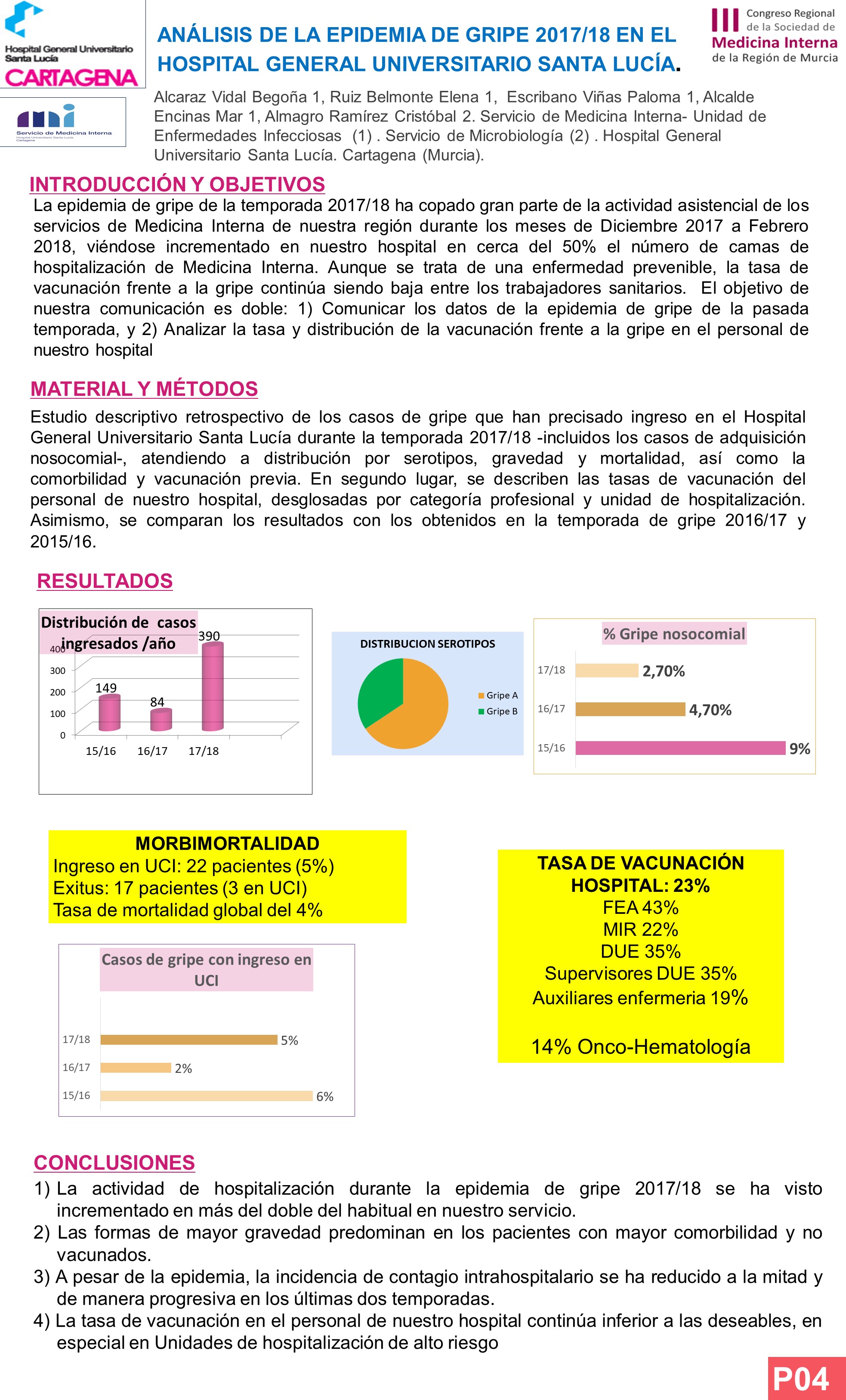 | P04 | Título: Análisis de la epidemia de gripe 2017/18 en el Hospital General Universitario Santa Lucía. Autores: B. Alcaraz Vidal; E. Ruiz Belmonte; P. Escribano Viñas; M. Alcalde Encinas; C. Almagro Ramírez. |