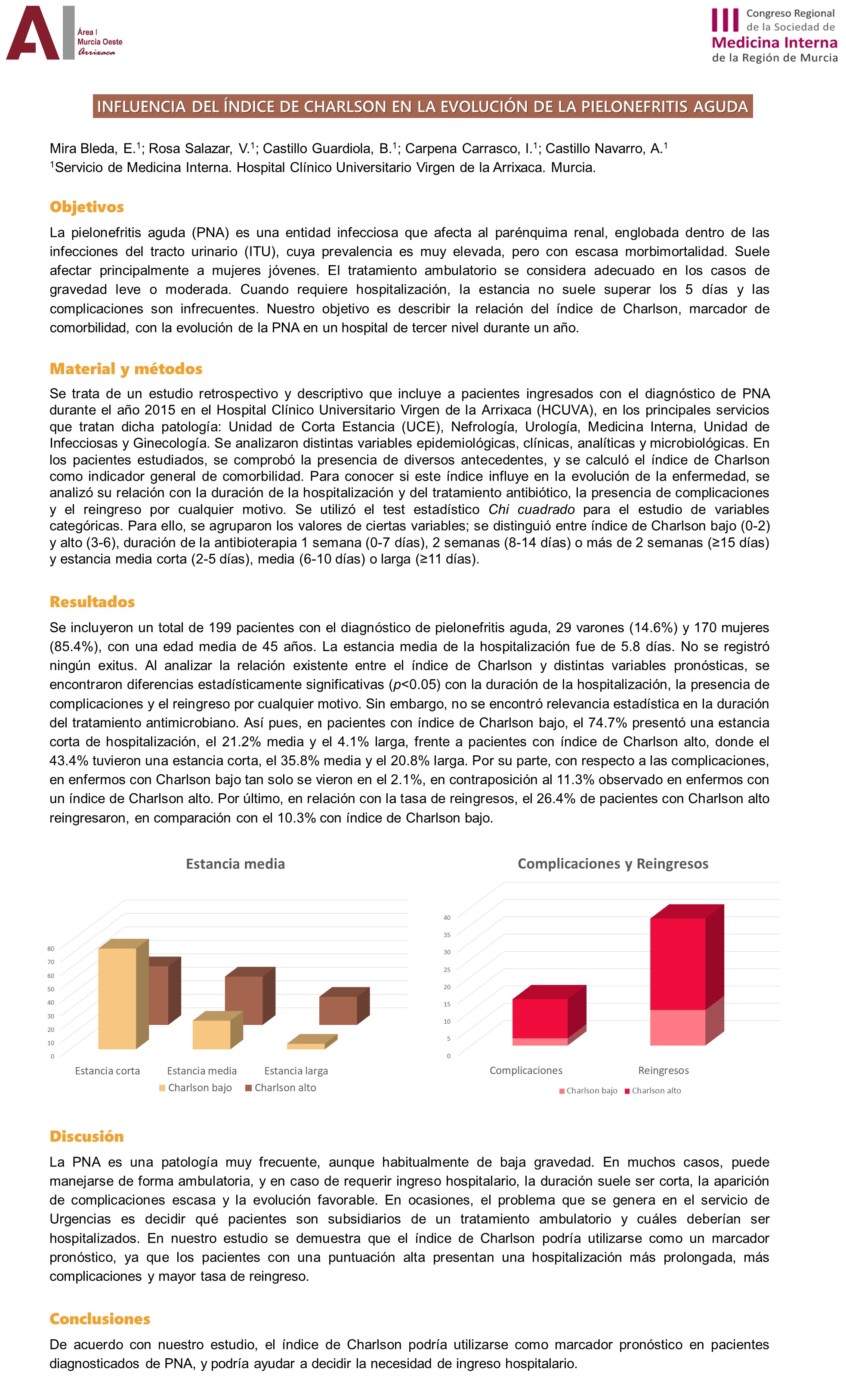 | P05 | Título: Influencia del índice de Charlson en la evolución de la pielonefritis aguda. Autores: E. Mira Bleda; V. Rosa Salazar; B Castillo Guardiola; I. Carpena Carrasco; A. Castillon Navarro. |