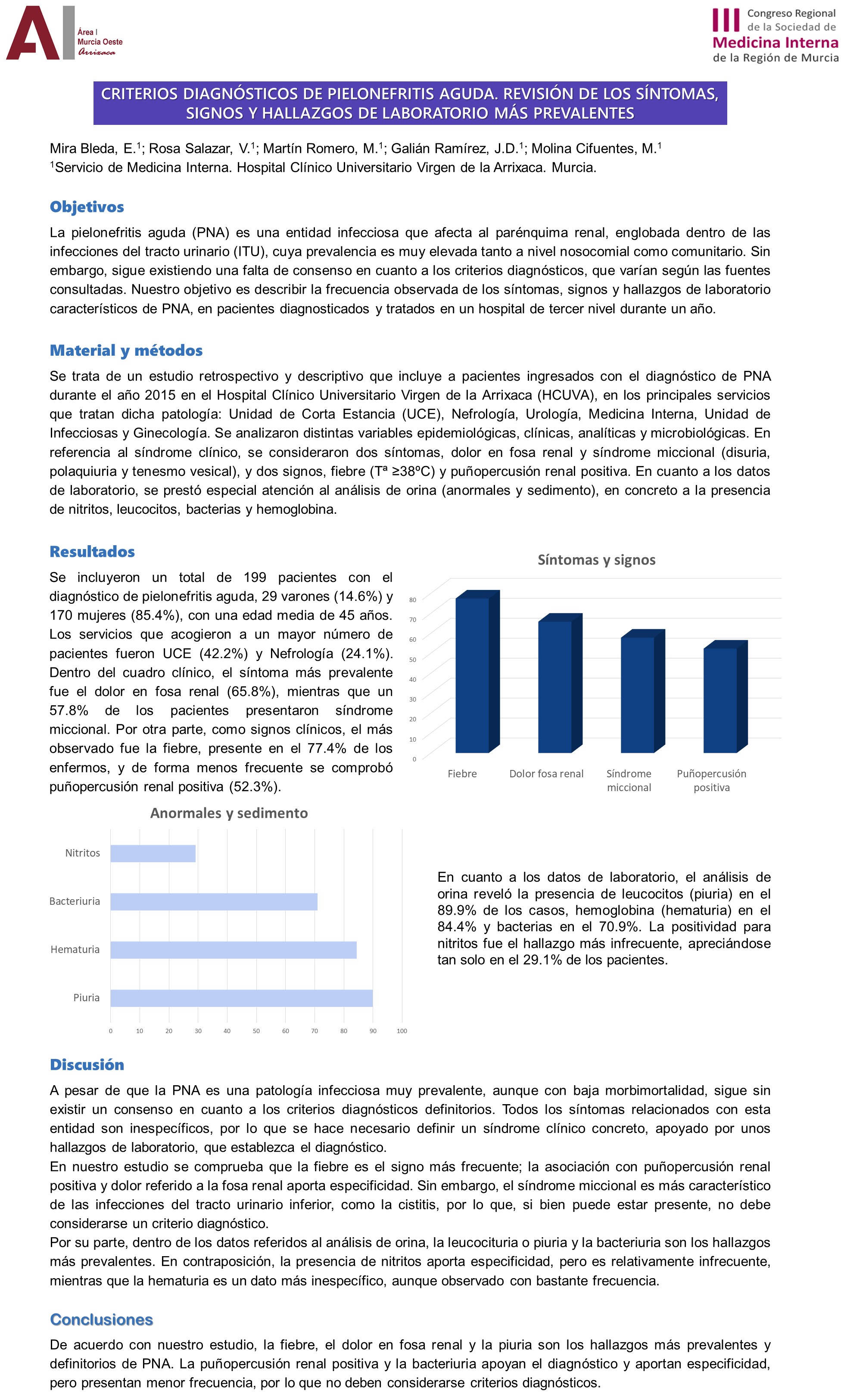 | P06 | Título: Criterios diagnósticos de pielonefritis aguda. Revisión de los síntomas, signos y hallazgos de laboratorio más prevalentes. Autores: E. Mira Bleda; V. Rosa Salazar; M. Martín Romero; J.D. Galián Ramírez; M. Molina Cifuentes. |