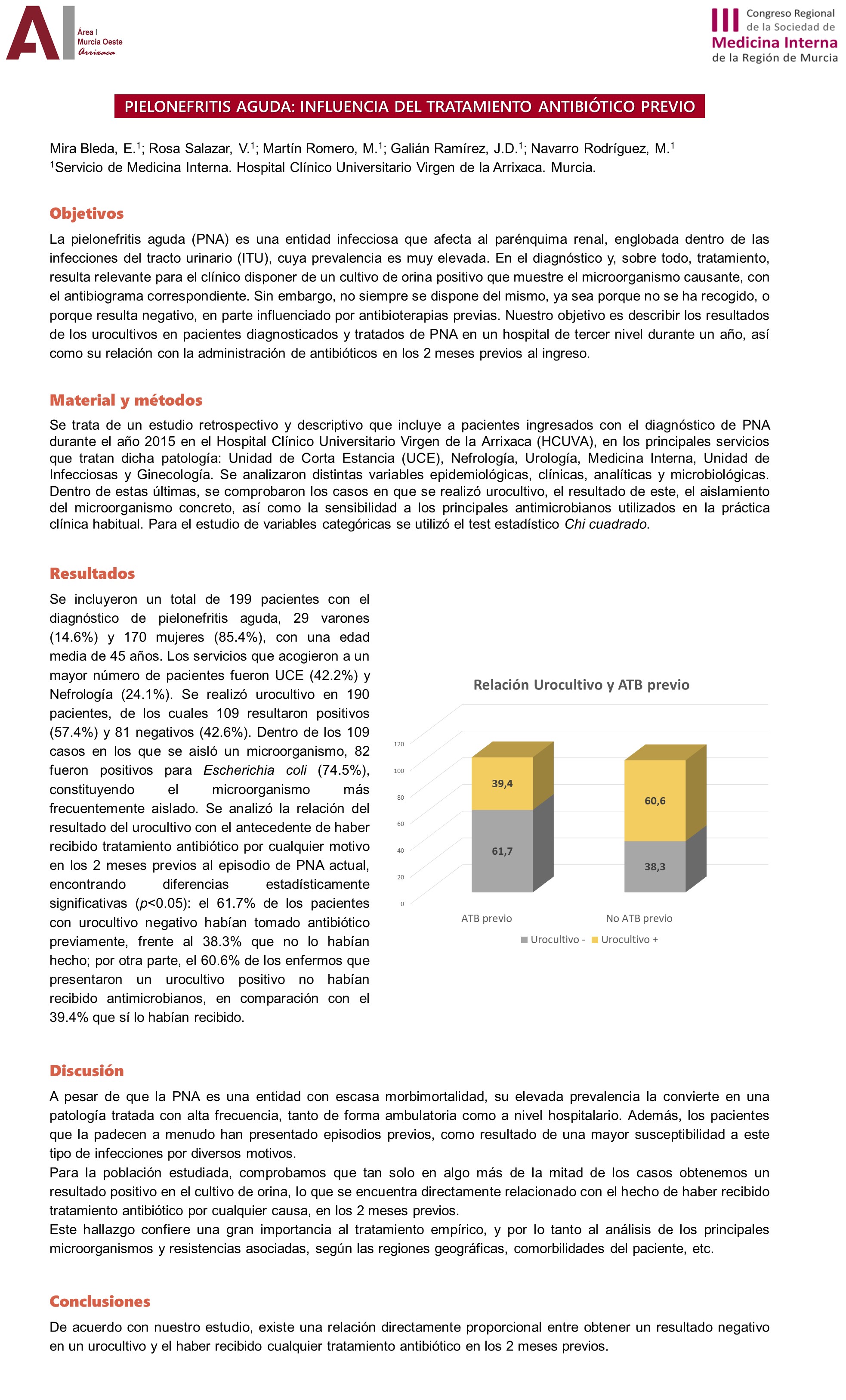 | P07 | Título: Pielonefritis aguda: influencia del tratamiento antibiótico previo. Autores: E. Mira Bleda; V. Rosa Salazar; M. Martín Romero; J.D. Galián Ramírez; M. Navarro Rodríguez. |