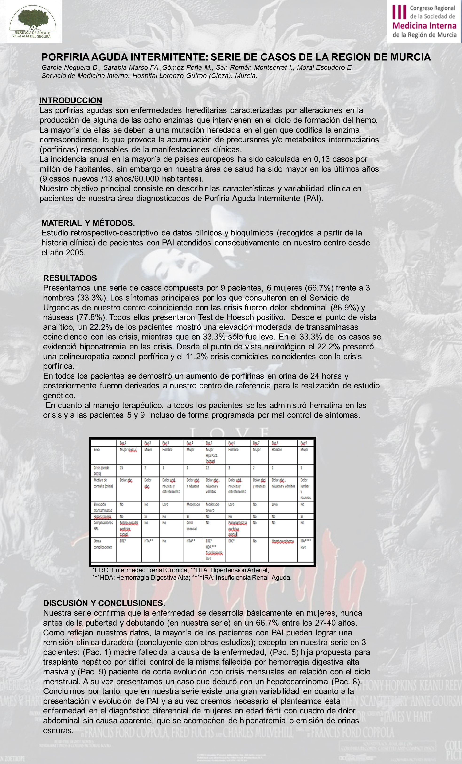 | P08 | Título: Porfiria aguda intermitente: serie de casos de la Región de Murcia. Autores: D. García Noguera; F.A. Sarabia Marco; M. Gómez Peña; I. San Román Monserrat; E. Moral Escudero. |