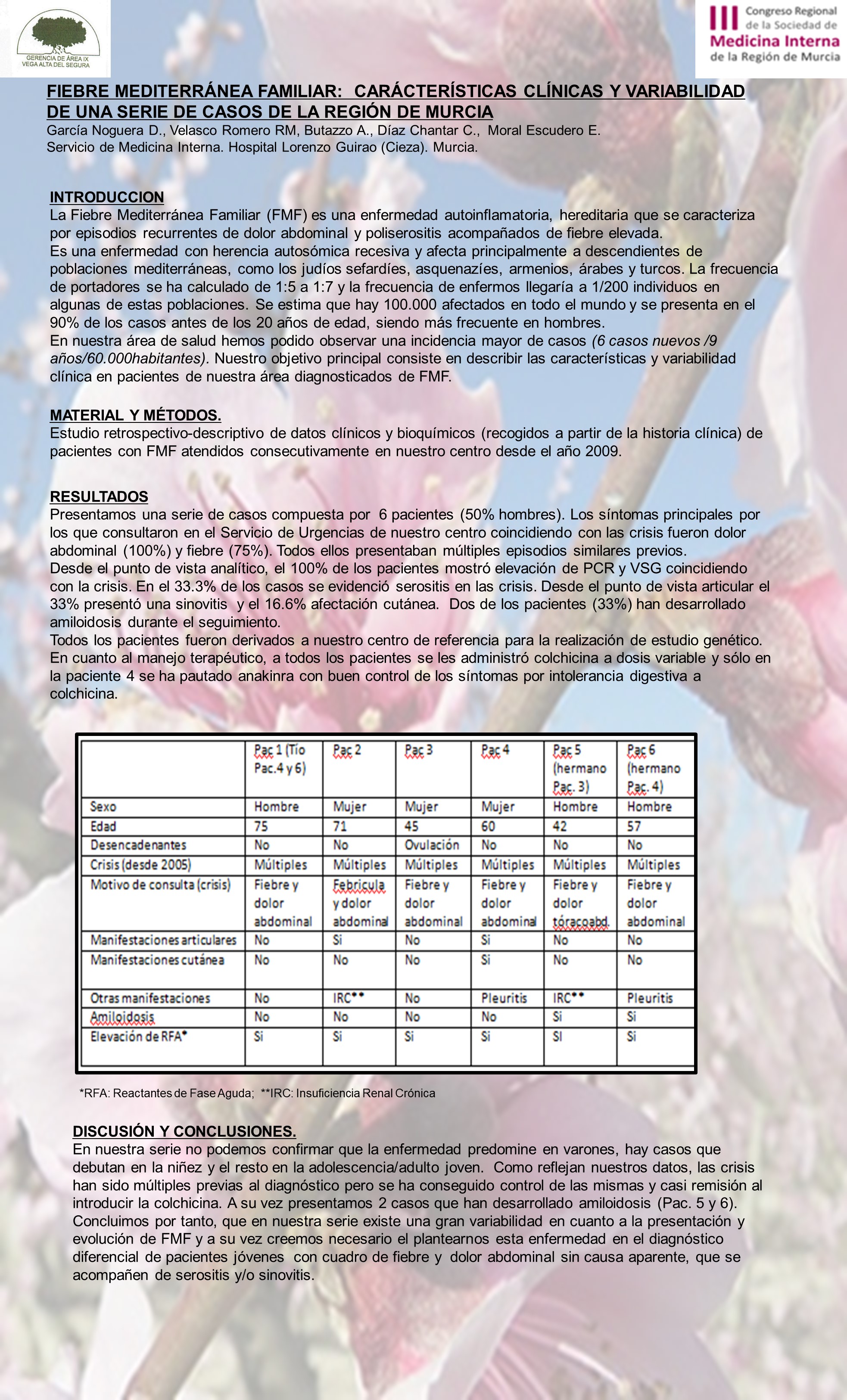 | P09 | Título: Fiebre mediterránea familiar: características clínicas y variabilidad de una serie de casos de la Región de Murcia. Autores: D. García Noguera; R.M. Velasco Romero; A. Butazzo; C. Díaz Chantar; E. Moral Escudero. |
