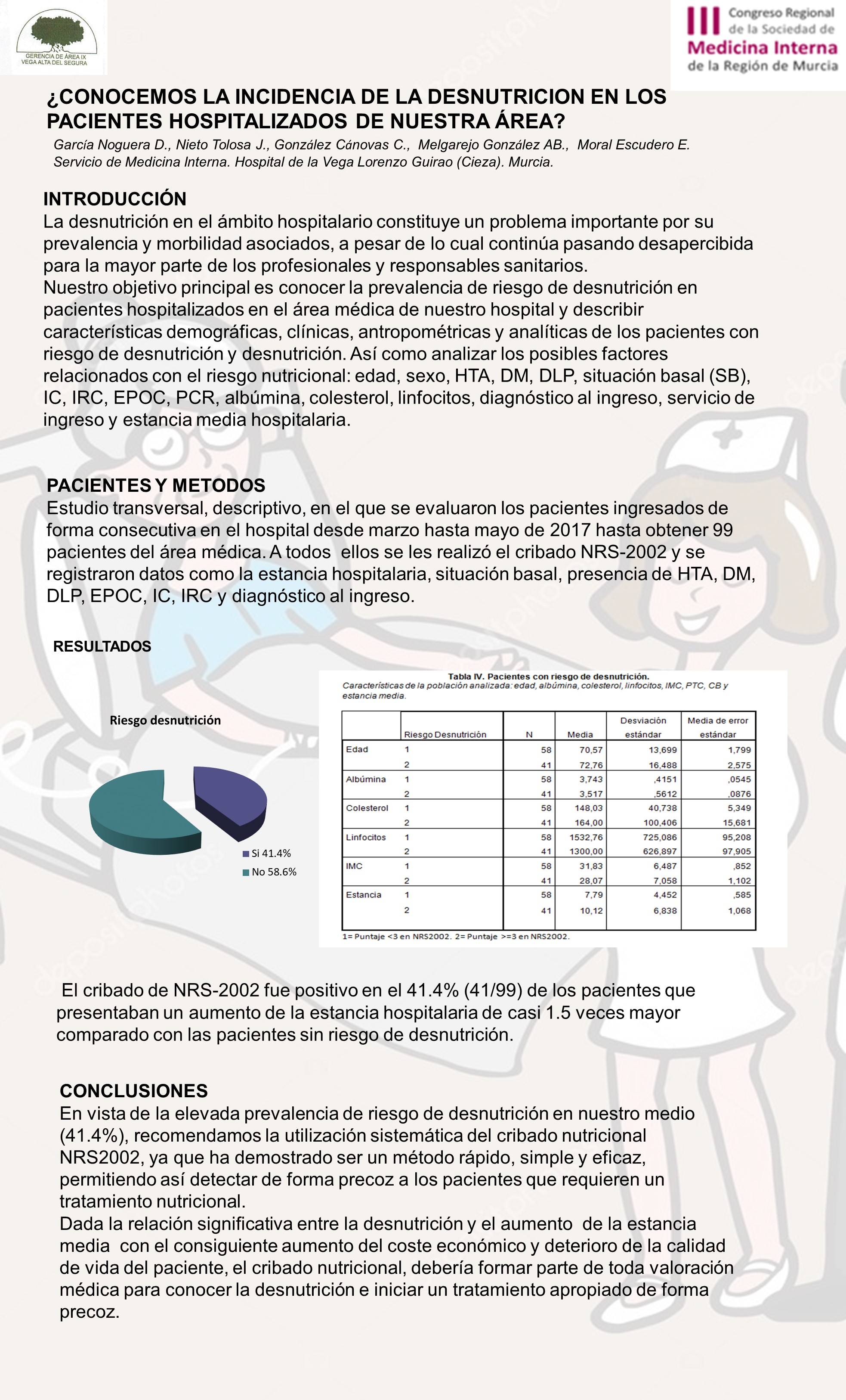 | P10 | Título: ¿Conocemos la incidencia de la desnutrición en los pacientes hospitalizados en nuestra área? Autores: D. García Noguera; J. Nieto Tolosa; C. González Cánovas; A.B. Melgarejo González; E. Moral Escudero. |
