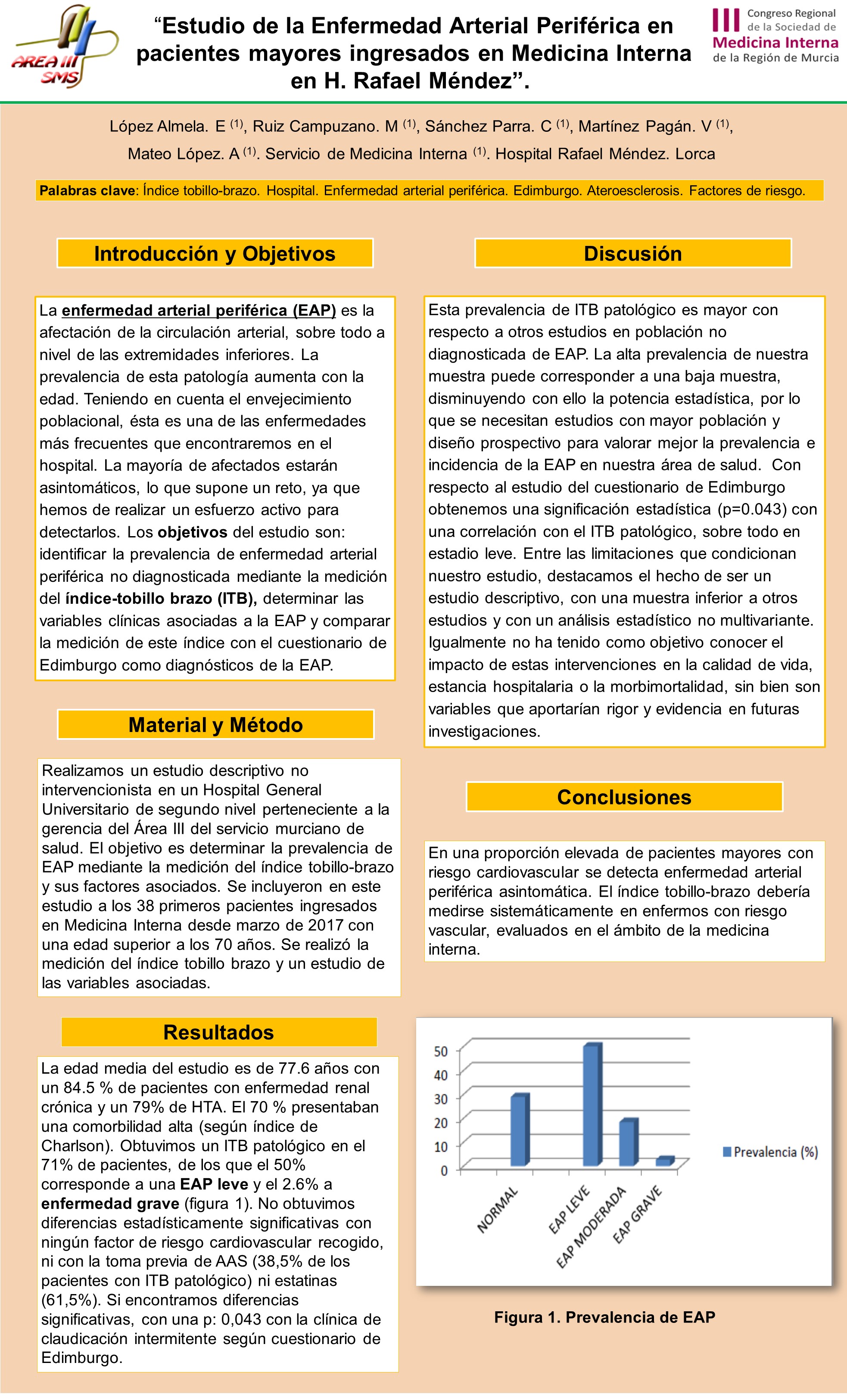 | P12 | Título: Estudio de la enfermedad arterial periférica en pacientes mayores ingresados en Medicina Interna ew H. Rafael Méndez. Autores: E. López Almela; M. Ruiz Campuzano; C. Sánchez Parra; V. Martínez Pagán; A. Mateo López. |
