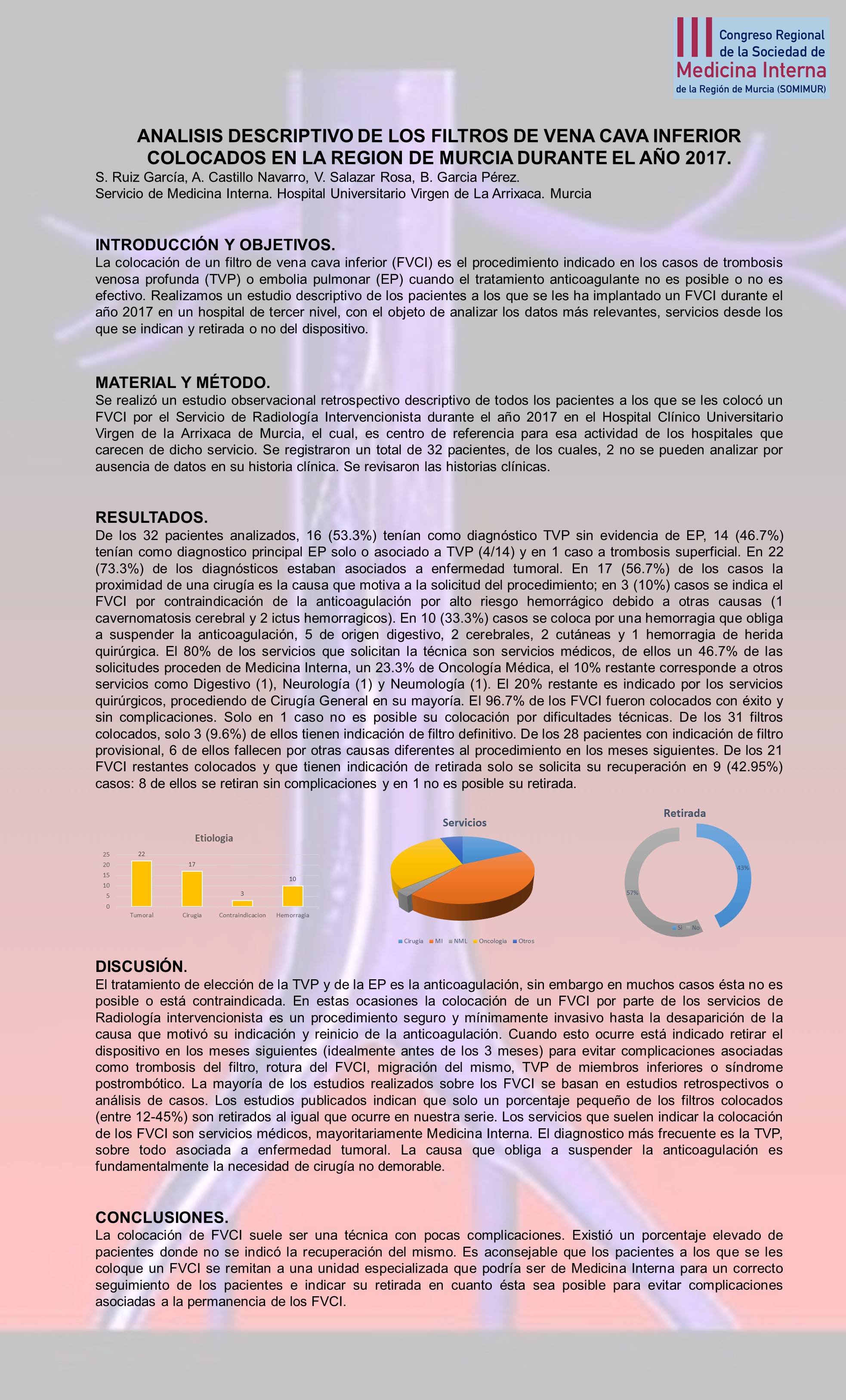| P13 | Título: Análisis descriptivo de los filtros de vena cava inferior colocados en la Región de Murcia durante el año 2017. Autores: S. Ruiz García; A. Castillo Navarro; V. Rosa Salazar, B. García Pérez. |