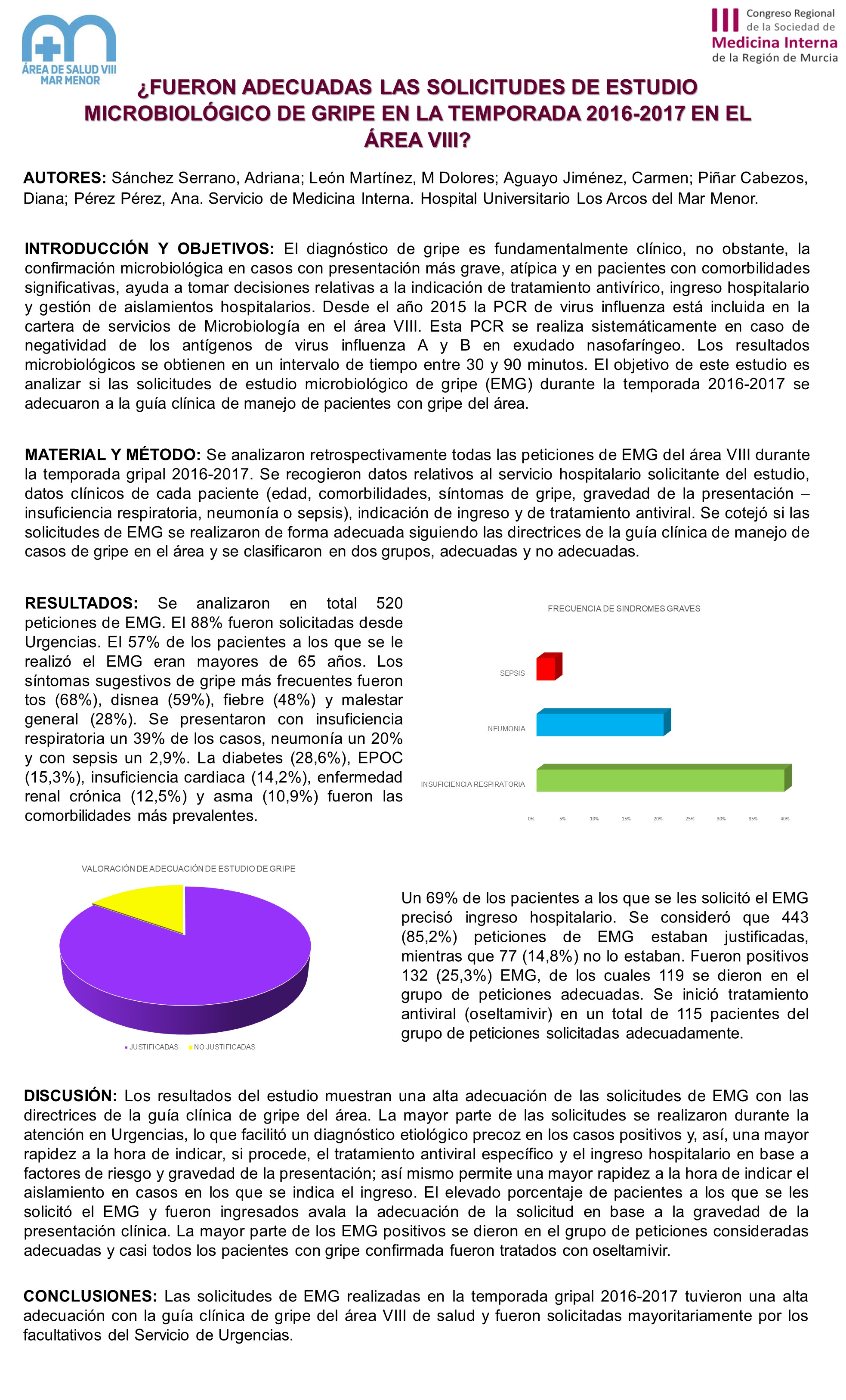 | P14 | Título: ¿Fueron adecuadas las solicitudes de estudio microbiológico de gripe en la temporada 2016-2017 en el área VIII? Autores: A. Sánchez Serrano; M.D. León Martínez; C. Aguayo Giménez; D. PIñar Cabezos; A. Pérez Pérez. |