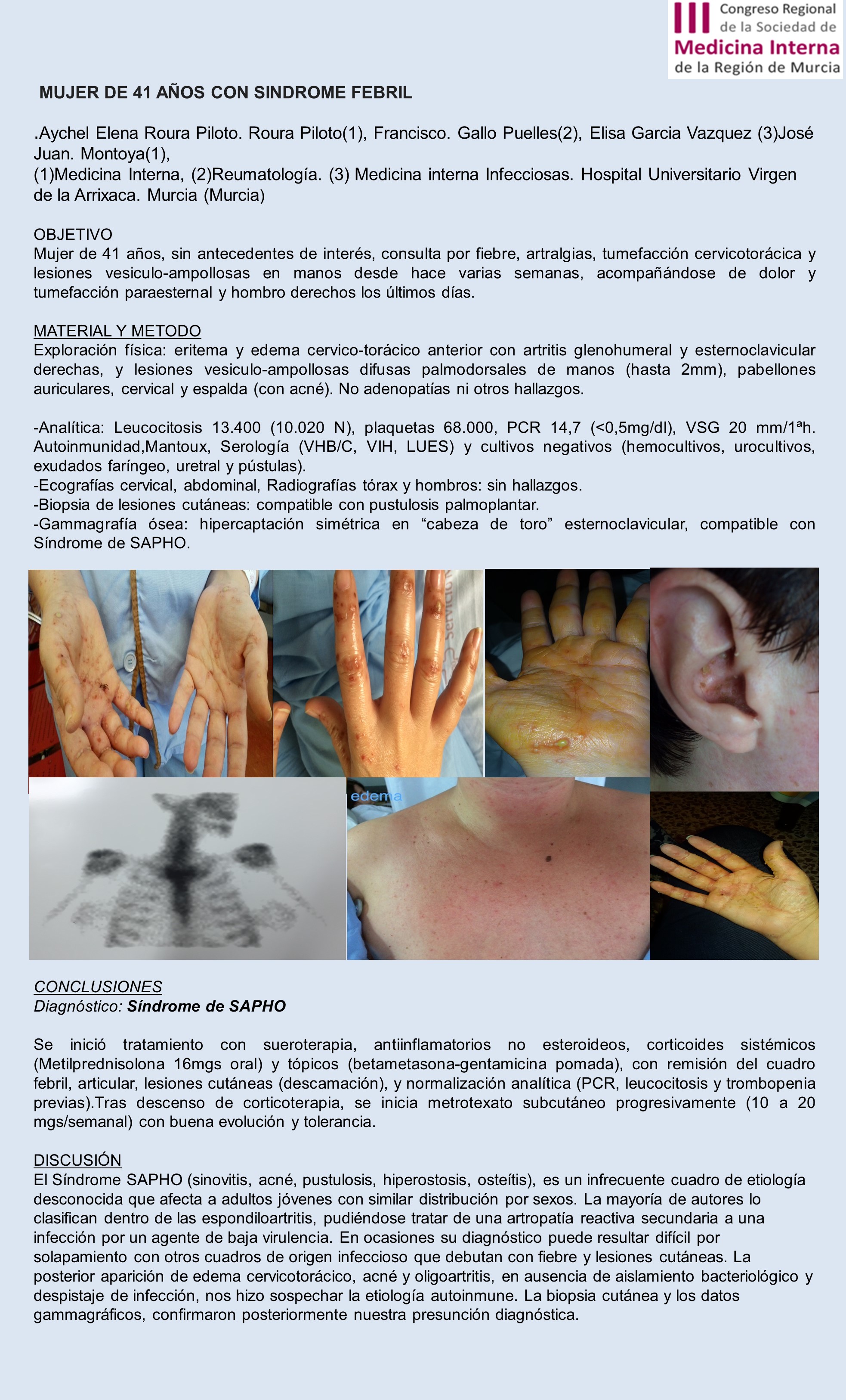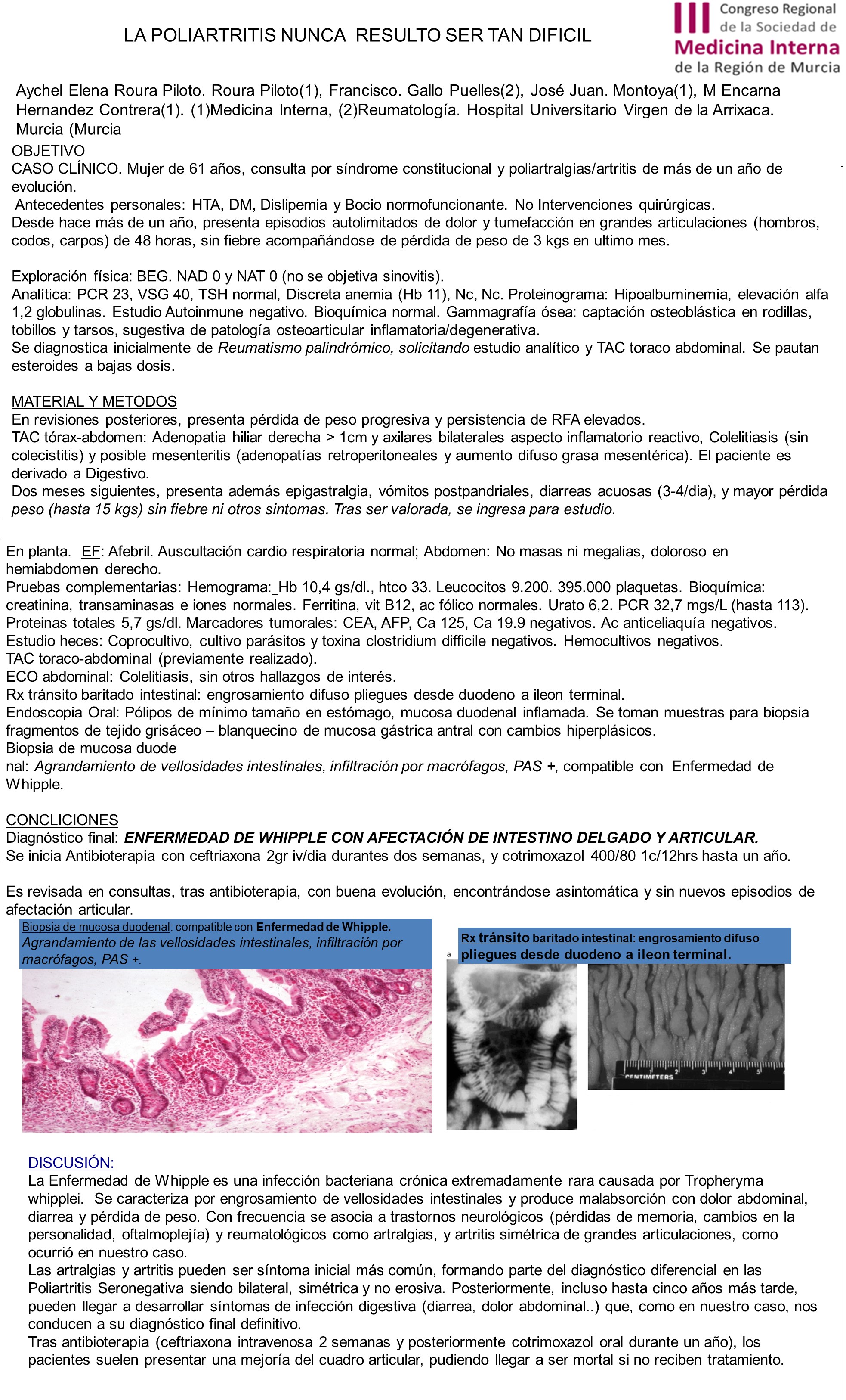 | P17 | Título: La poliartritis nunca resultó ser tan difícil. Autores: A.E. Roura Piloto; F. Gallo Puelles; J.J. Montoya; M.E. Hernández Contrera. |