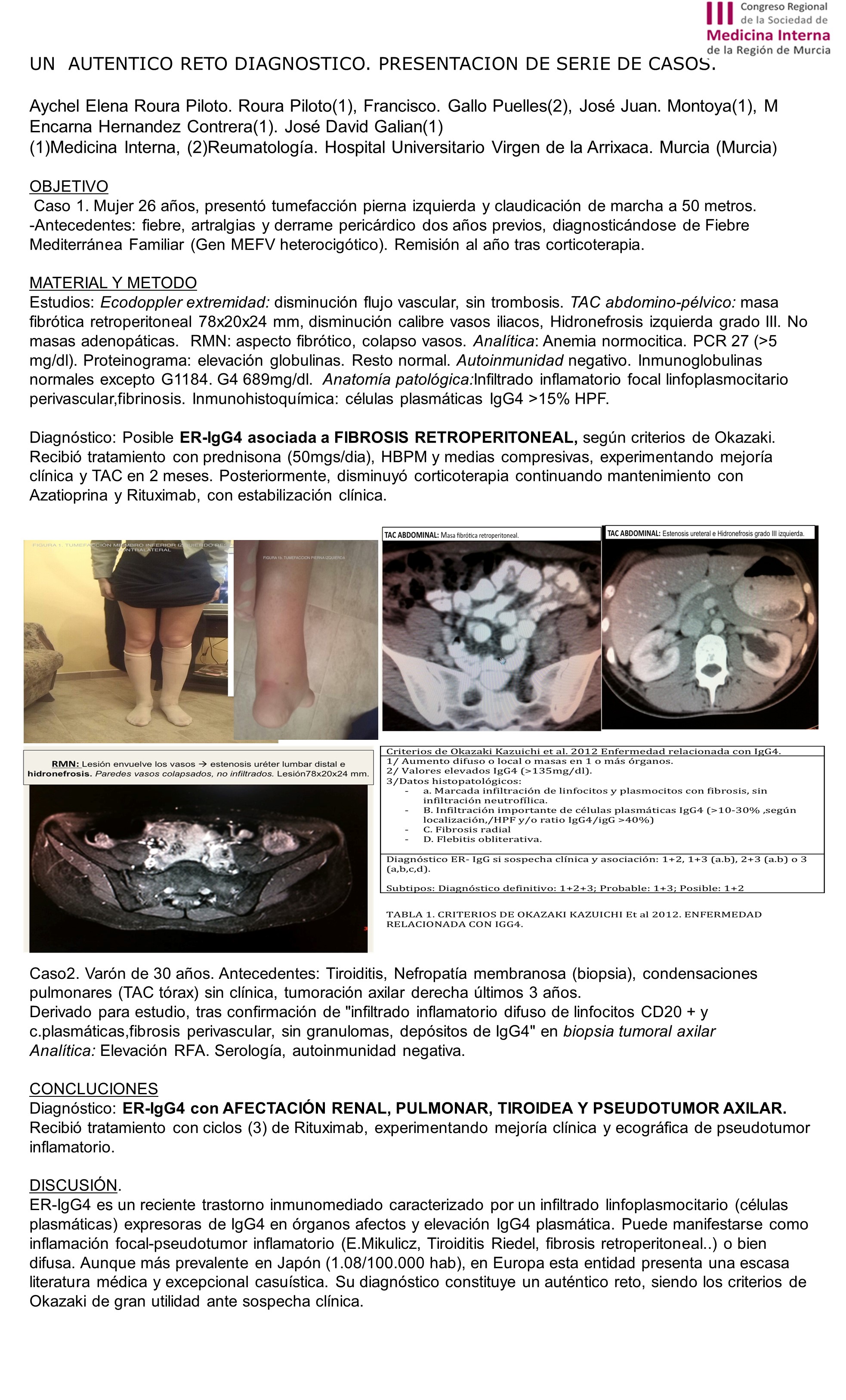 | P18 | Título: Un auténtico reto diagnóstico. Presentación de serie de casos. Autores: A.E. Roura Piloto; F. Gallo Puelles; J.J. Montoya; M.E. Hernández Contrera; J.D. Galián Ramírez. |