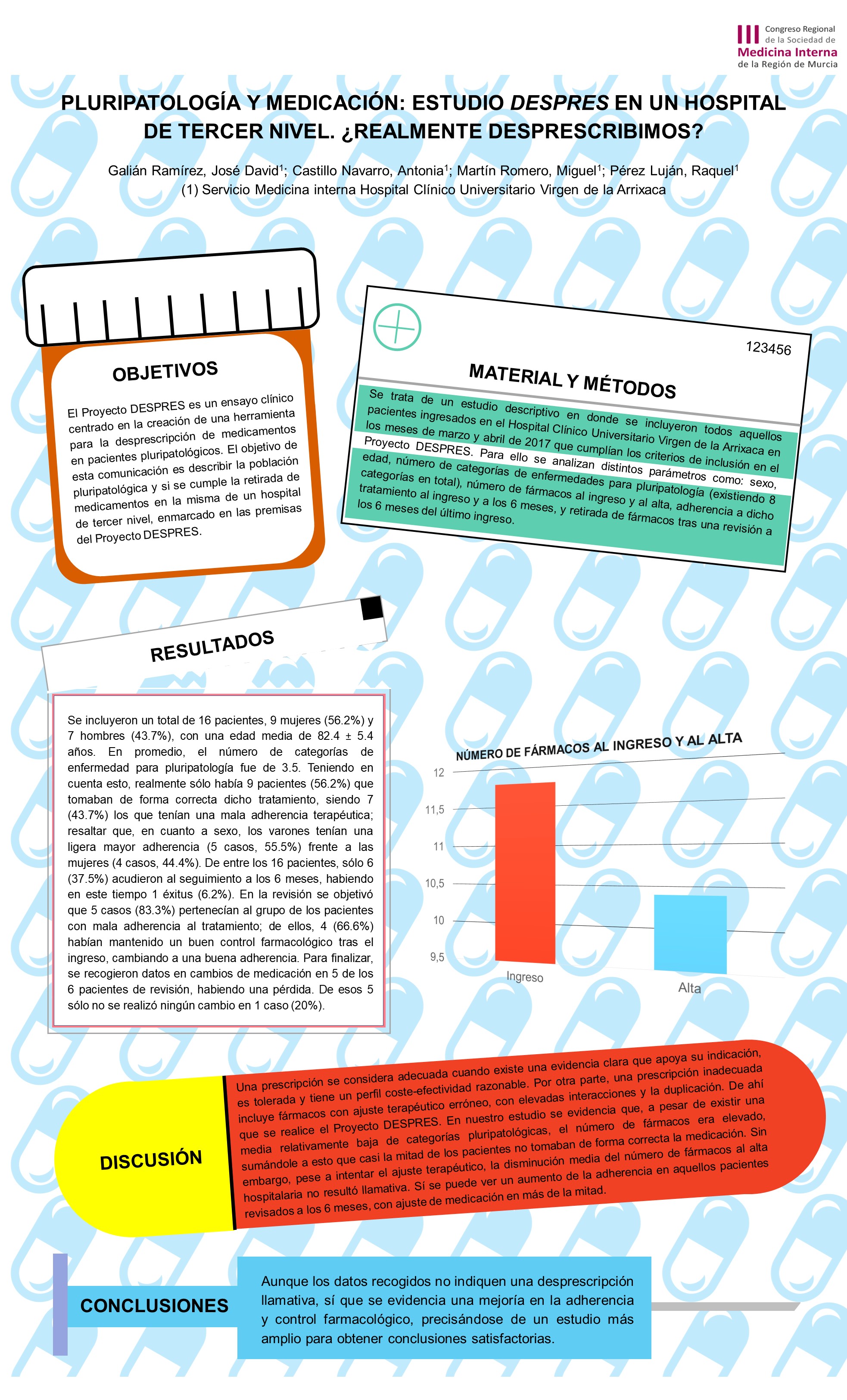 | P19 | Título: Pluripatología y medicación: estudio DESPRES en un hospital de tercer nivel. ¿Realmente desprescribimos? Autores: J.D. Galián Ramírez; A. Castillo Navarro; M. Martín Romero; R. Pérez Luján. |