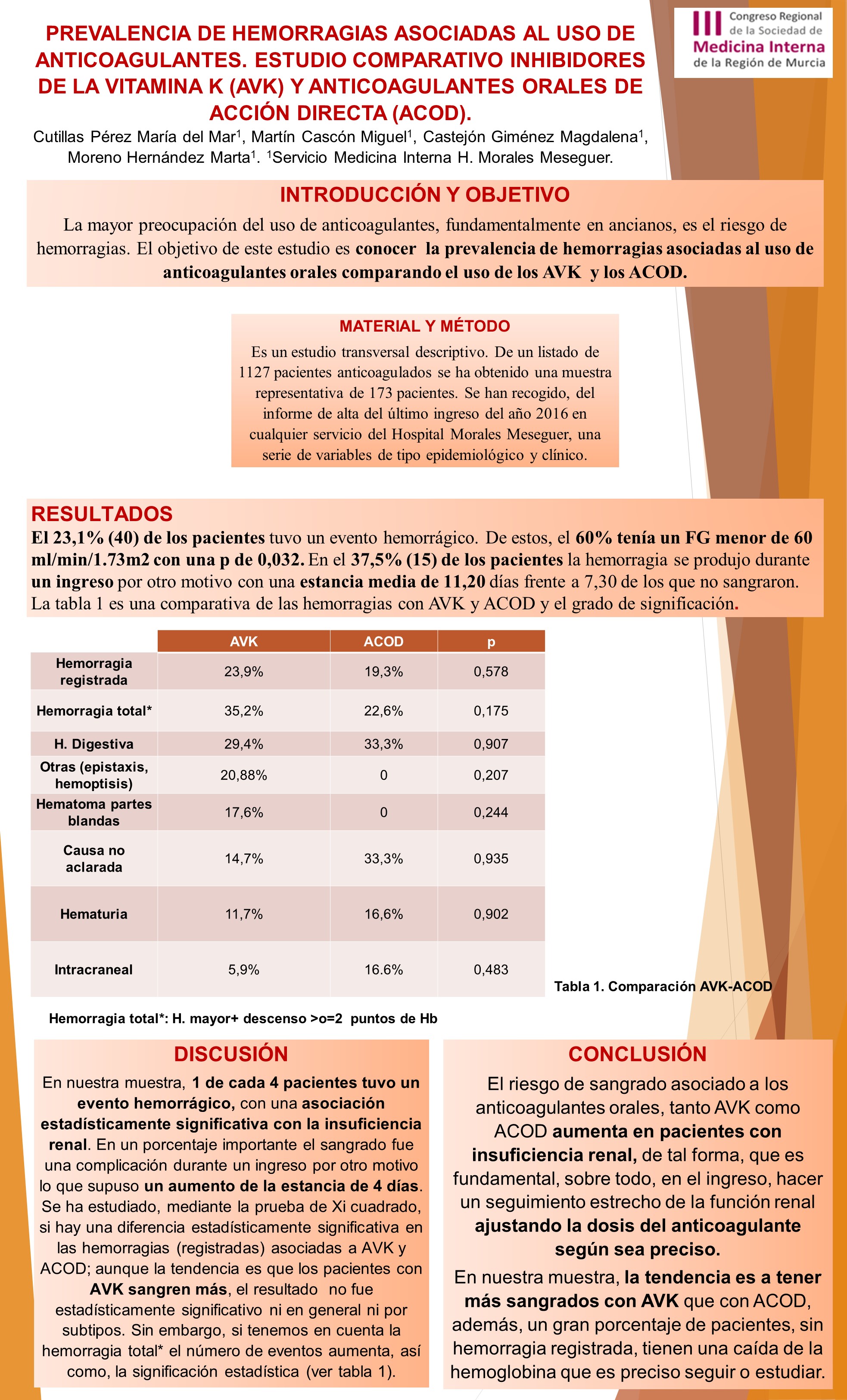 | P23 | Título: Prevalencia de hoemorragias asociadas al uso de anticoagulantes. Estudio comparativo inhibidores de la vitamina K (AVK) y anticoagulantes orales de acción directa (ACOD). Autores: M.M. Cutillas Pérez; M. Martín Cascón; M. Castejón Giménez; M. Moreno Hernández. |