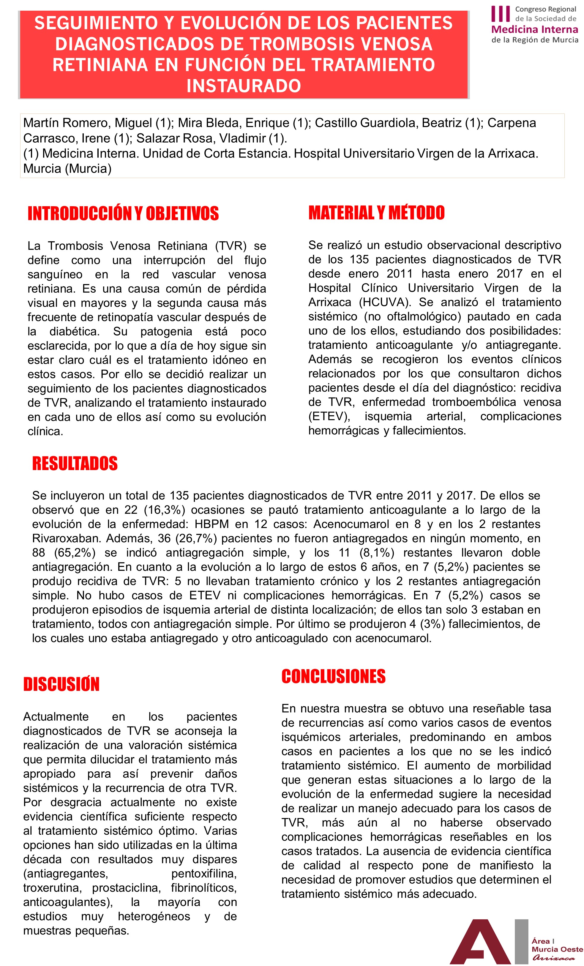 | P26 | Título: Seguimiento y evolución de los pacientes diagnosticados de trombosis venosa retiniana en función del tratamiento instaurado. Autores: M. Martín Romero; E. Mira Bleda; B. Castillo Guardiola; I. Carpena Carrasco; V. Rosa Salazar. |
