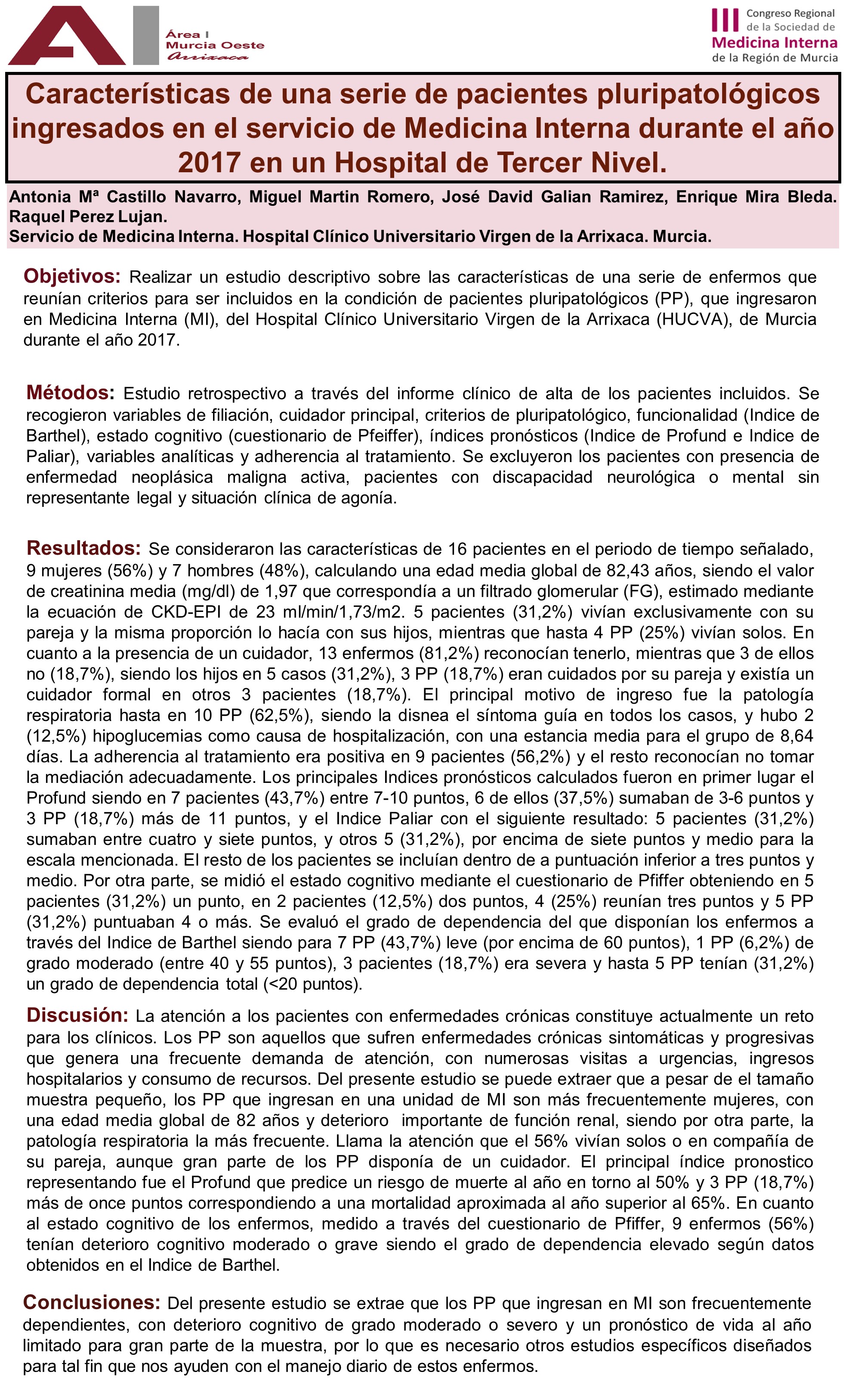 | P28 | Título: Características de una serie de pacientes pluripatológicos ingresados en el servicio de Medicina Interna durante el año 2017 en un hospital de tercer nivel. Autores: A.M. Castillo Navarro; M. Martín Romero; J.D. Galián Ramírez; E. Mira Bleda; R. Pérez Luján. |
