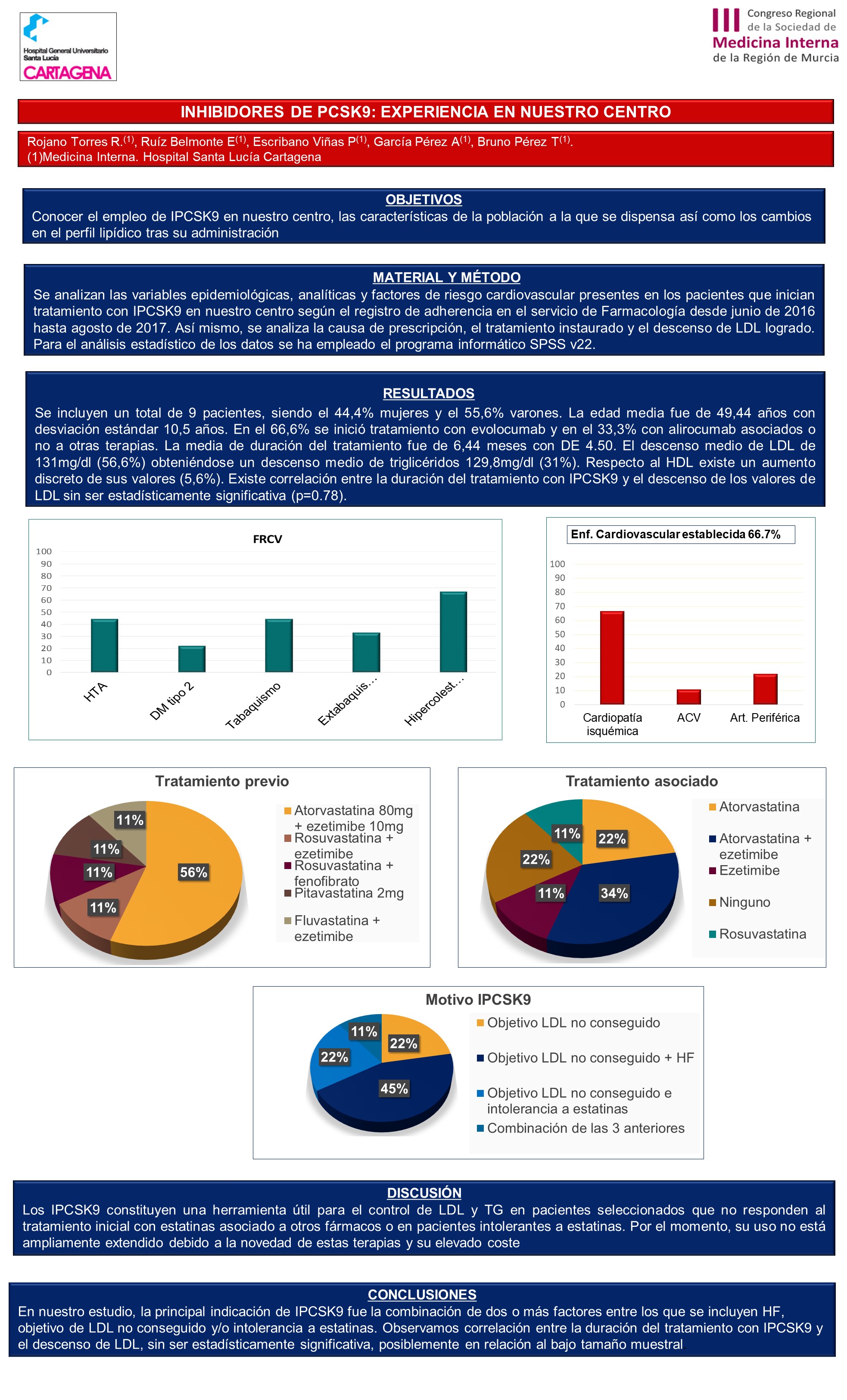 | P29 | Título: Inhibidores de PCSK9: experiencia en nuestro centro. Autores: R. Rojano Torres; E. Ruiz Belmonte; P. Escribano Viñas; A. García Pérez; T. Bruno Pérez. |