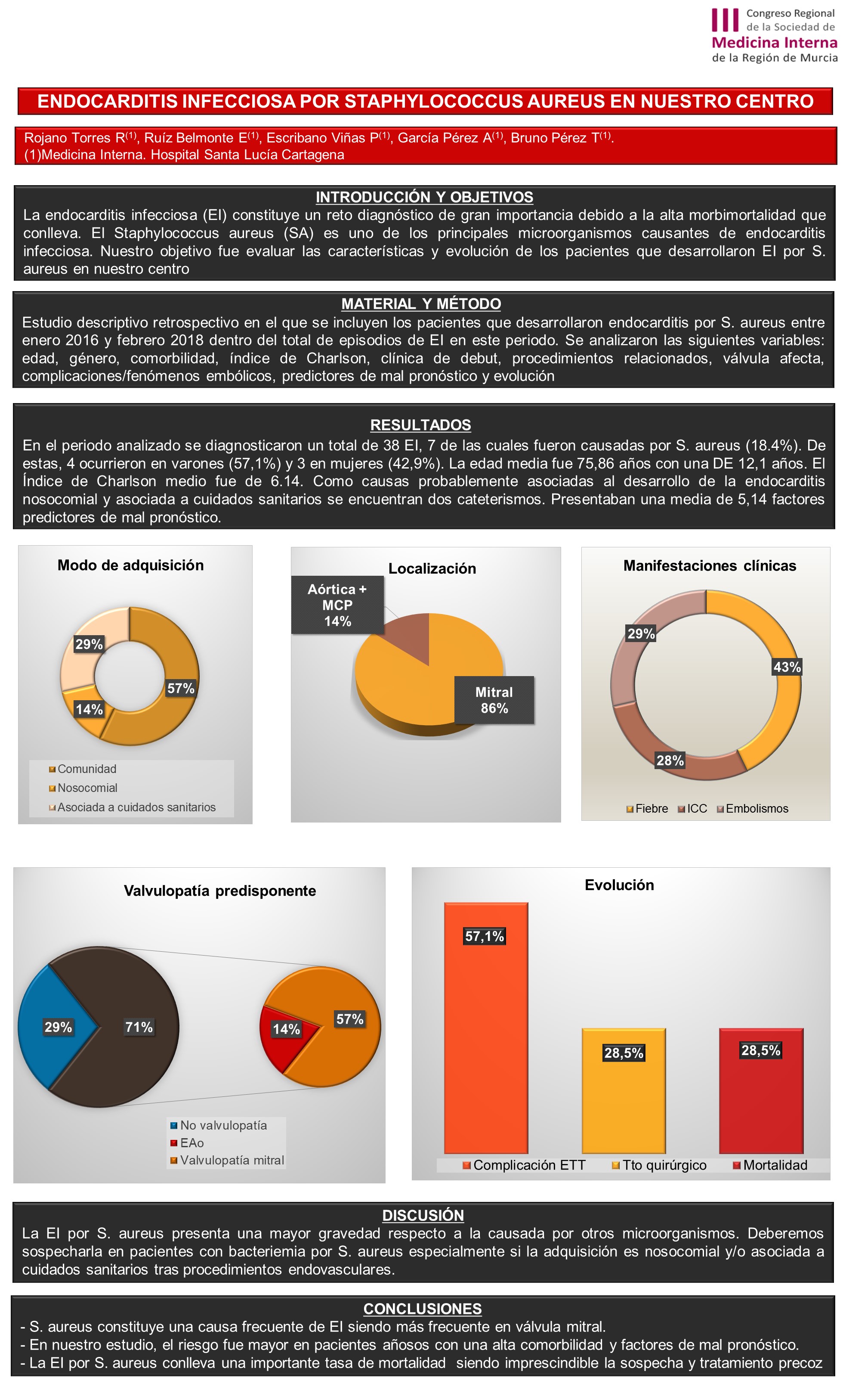| P30 | Título: Endocarditis infecciosa por Staphylococcus aureus en nuestro centro. Autores: R. Rojano Torres; E. Ruiz Belmonte; P. Escribano Viñas; T. Bruno Pérez. |