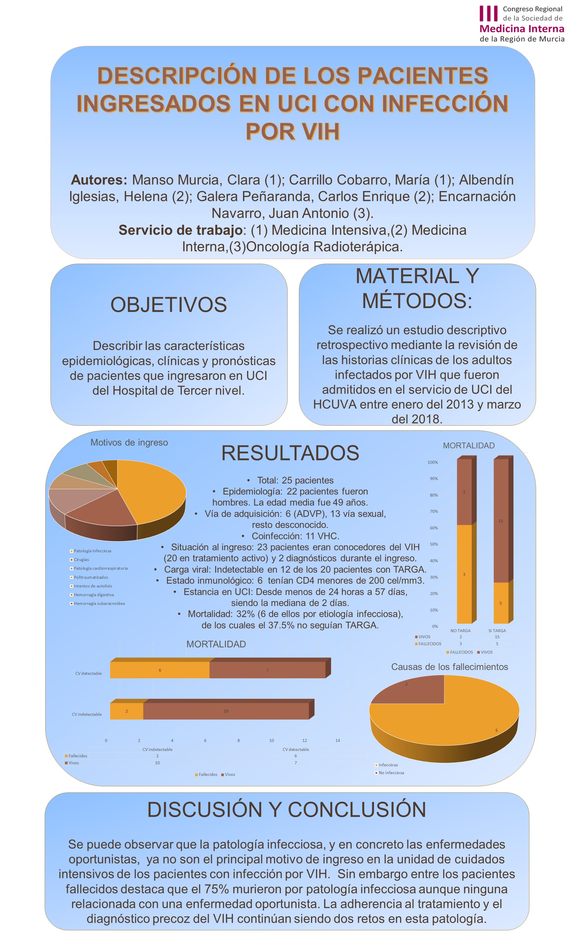 | P31 | Título: Descripción de los pacientes ingresados en UCI con infecci´´on por VIH. Autores: C. Manso Murcia; M. Carrillo Cobarro; H. Albendín Iglesias; C.E. Galera Peñaranda; J.A. Encarnación Navarro. |