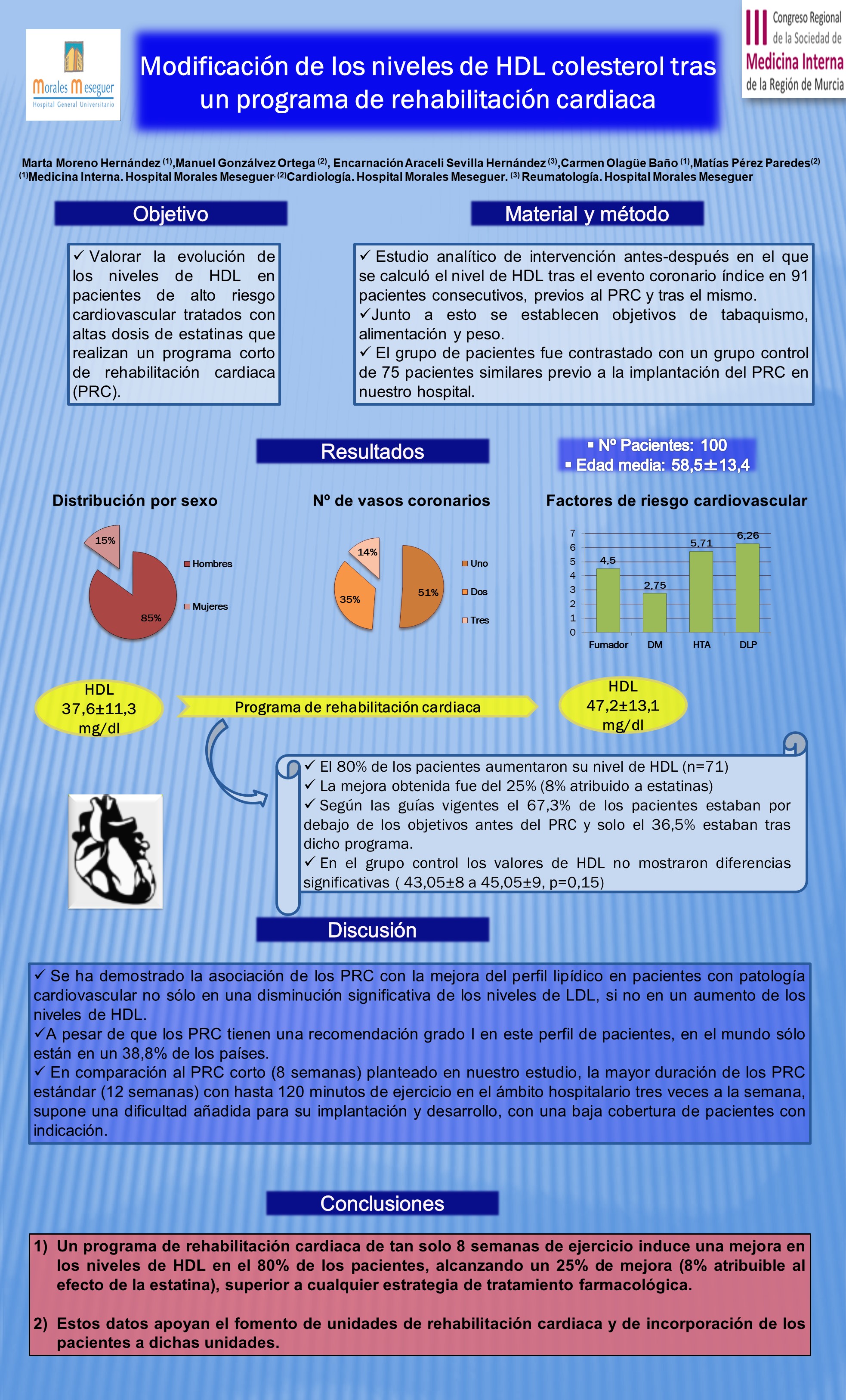 | P34 | Título: Modificación de los niveles de HDL colesterol tras un programa de rehabilitación cardíaca. Autores: M. Moreno Hernández; M. Gonzálvez Ortega; E.A. Sevilla Hernández; C. Olagüe Baño; M. Pérez Paredes. |