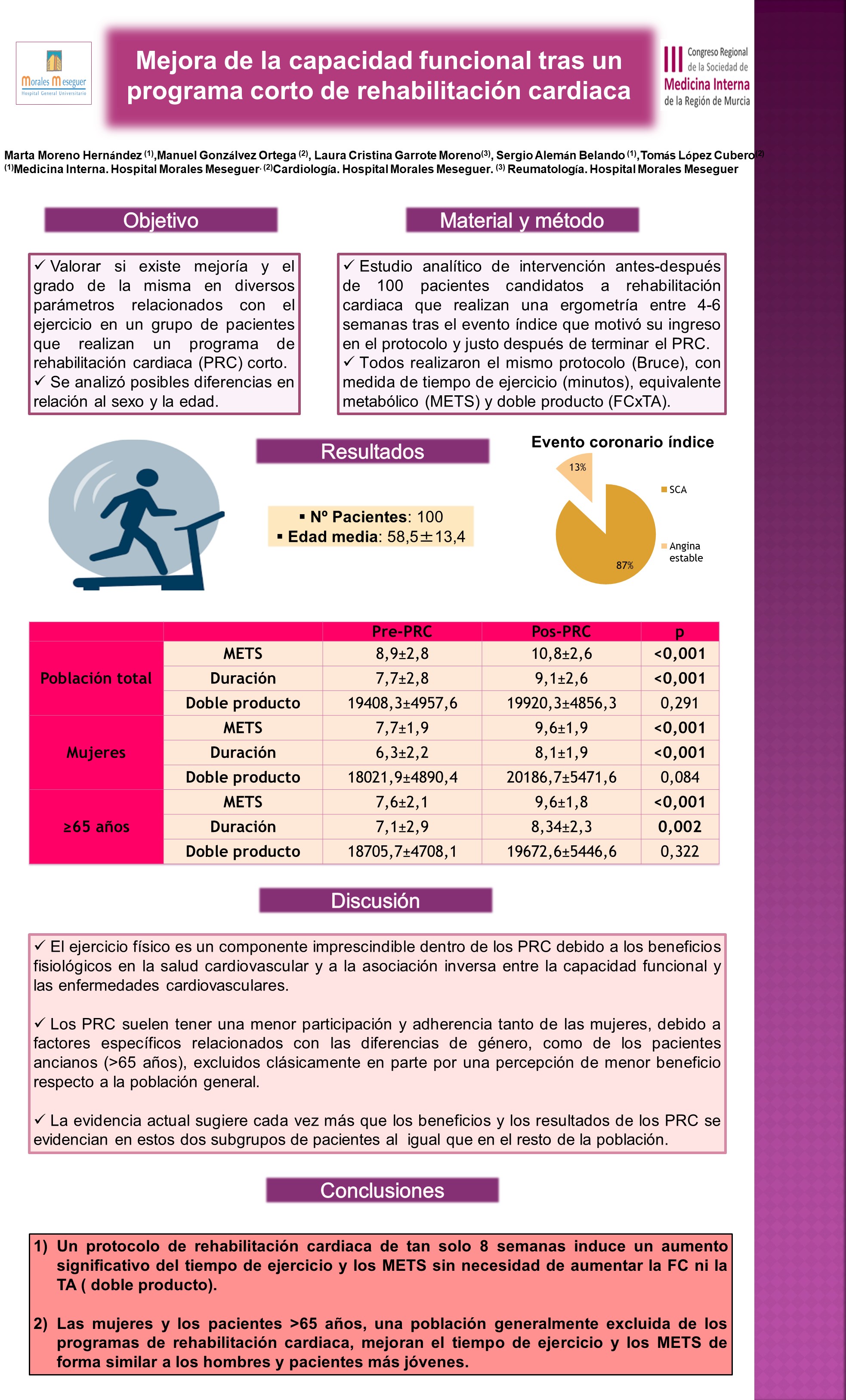 | P35 | Título: Mejora de la capacidad funcional tras un programa corto de rehabilitación cardíaca. Autores: M. Moreno Hernández; M. Gonzálvez Ortega; L.C. Garrote Moreno; S. Alemán Belando; T. Cubero López. |