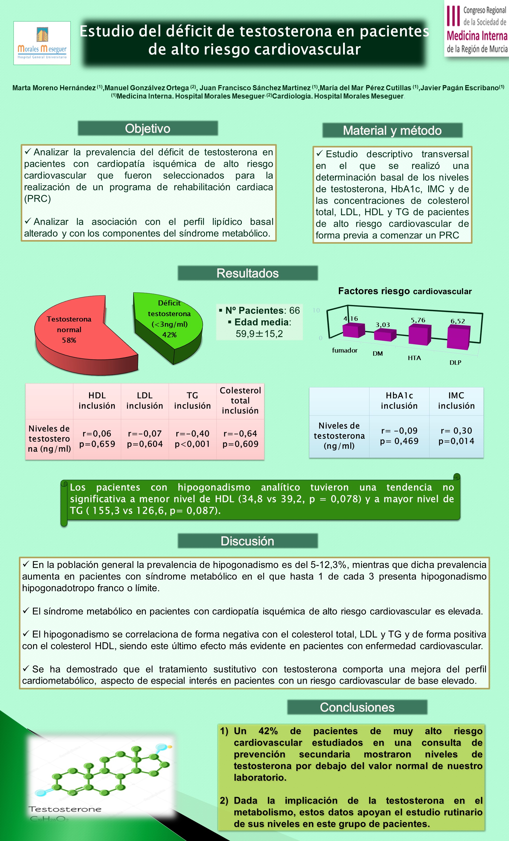 | P36 | Título: Estudio del déficit de testosterona en pacientes de alto riesgo cardiovascular. Autores: M. Moreno Hernández; M. Gonzálvez Ortega; J.F. Sánchez Martínez; M.M. Pérez Cutillas; J. Pagán Escribano. |