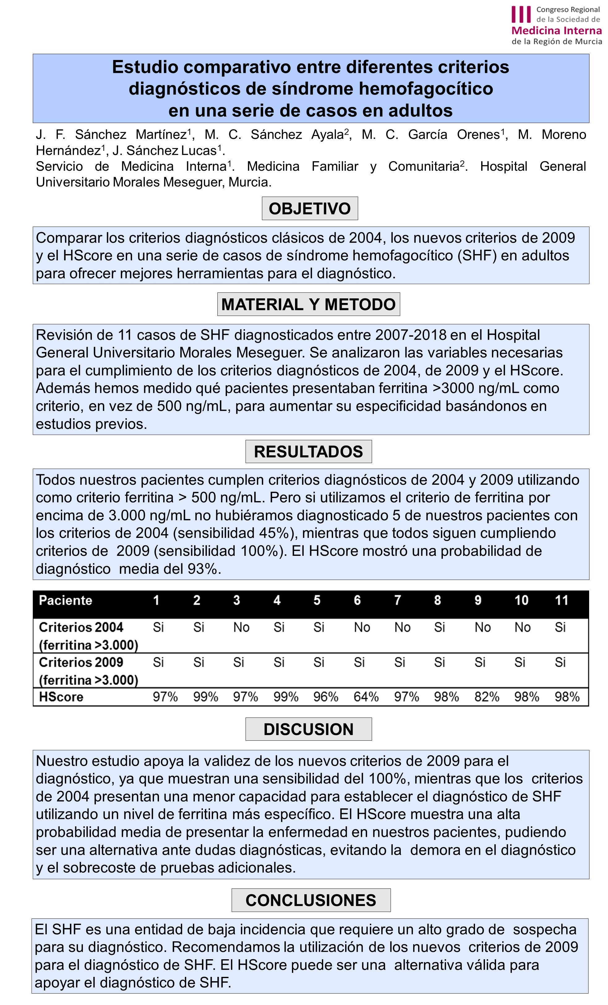 | P37 | Título: Estudio comparativo entre diferentes criterios diagnósticos de síndrome hemofagocítico en una serie de casos en adultos. Autores: J.F. Sánchez Martínez; M.C. Sánchez Ayala; M.C. García Orenes; M. Moreno Hernández; J. Sánchez Lucas. |