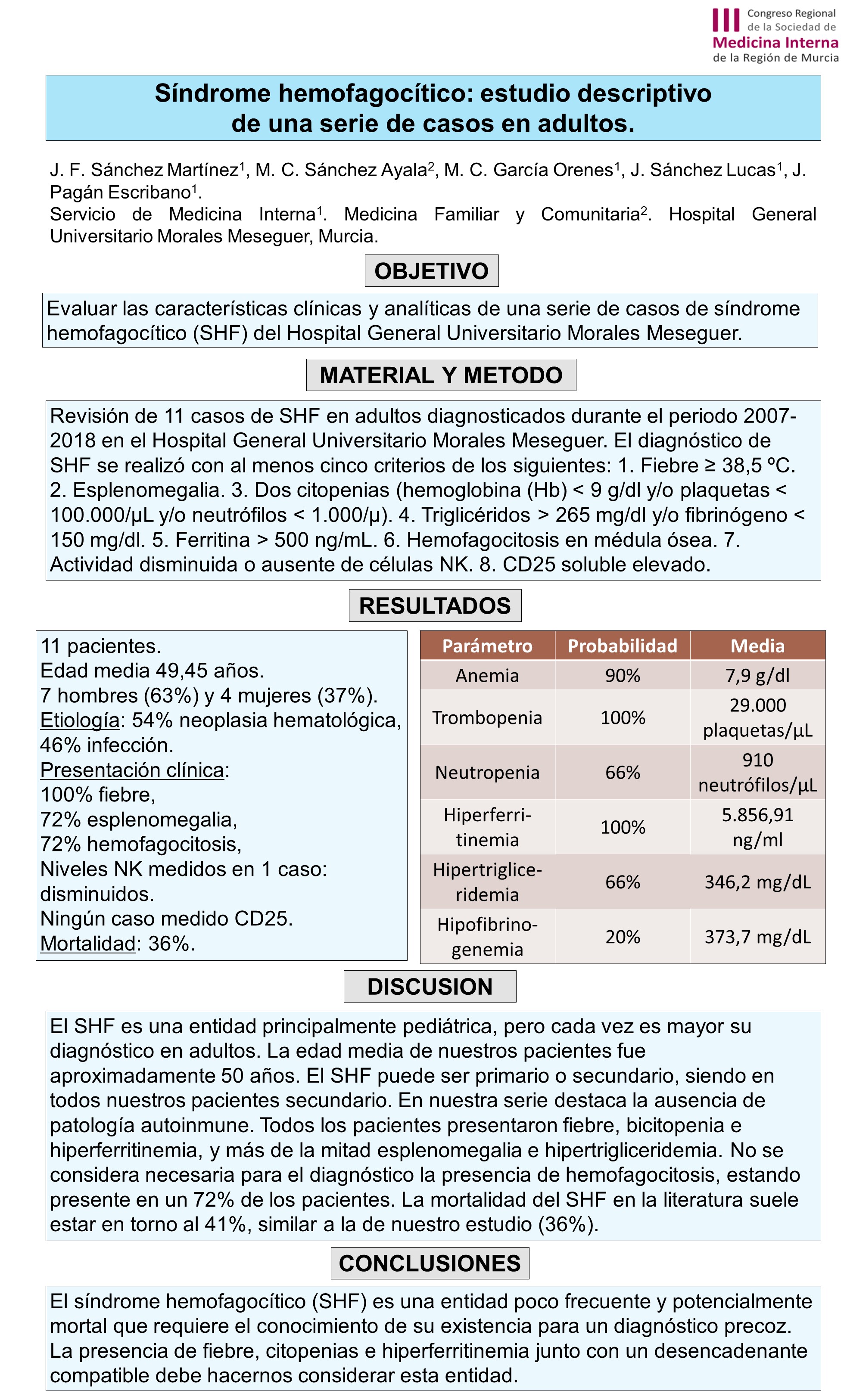 | P38 | Título: Síndrome hemofagocítico: estudio descriptivo de una serie de casos en adultos. Autores: J.F. Sánchez Martínez; M.C. Sánchez Ayala; M.C. García Orenes; J. Sánchez Lucas; J. Pagán Escribano. |
