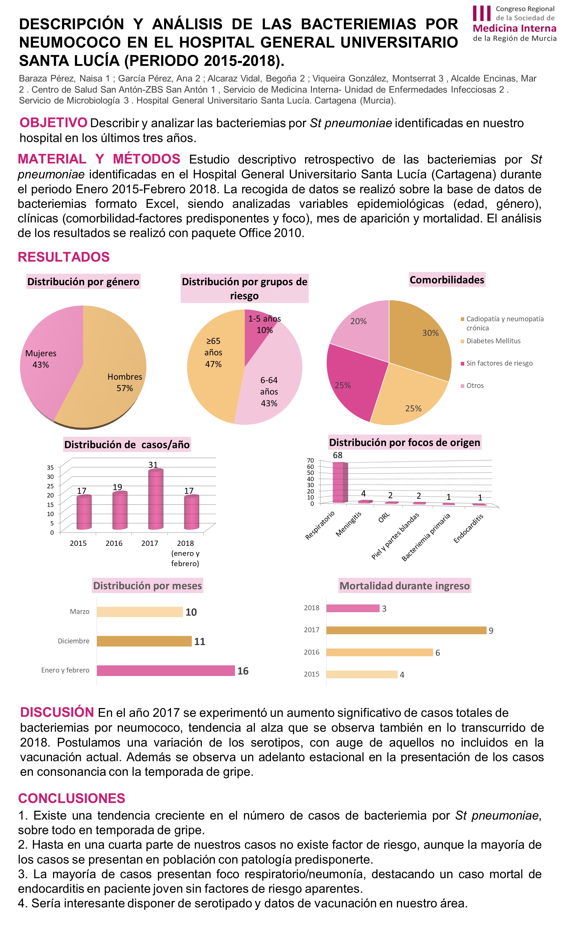 | P39 | Título: Descripción y análisis de las bacteriemias por neumococo en el Hospital General Univesitario Santa Lucía (periodo 2015-2018). Autores: N. Beraza Pérez; A. García Pérez; B. Alcaraz Vidal; M. Viqueira González; M. Alcalde Encinas. |