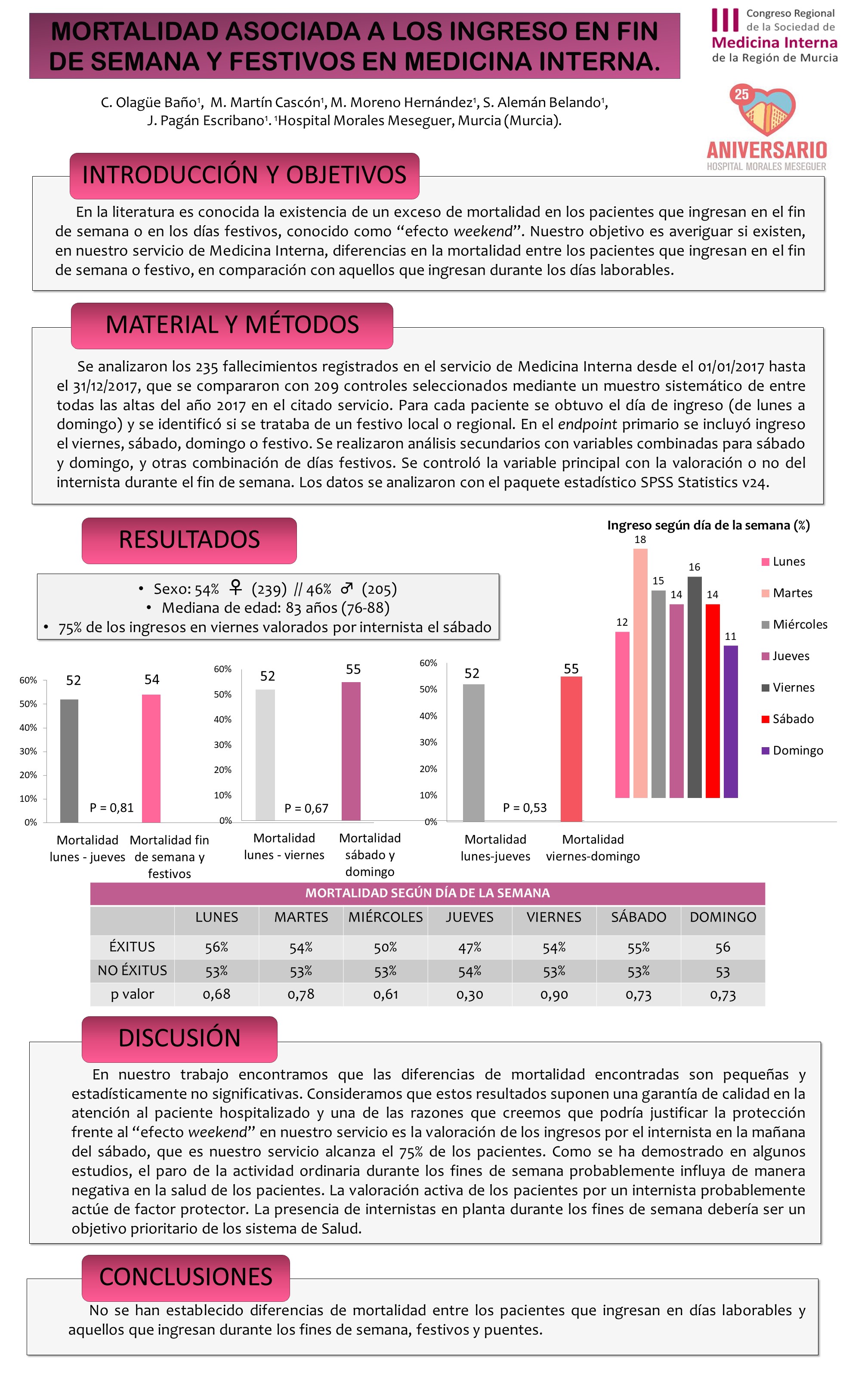 | P40 | Título: Moratalidad asociada a los ingresos en fin de semana y festivos en Medicina Interna. Autores: C. Olagüe Baño; M. Martín Cascón; M. Moreno Hernández; S. Alemán Belando; J. Pagán Escribano. |