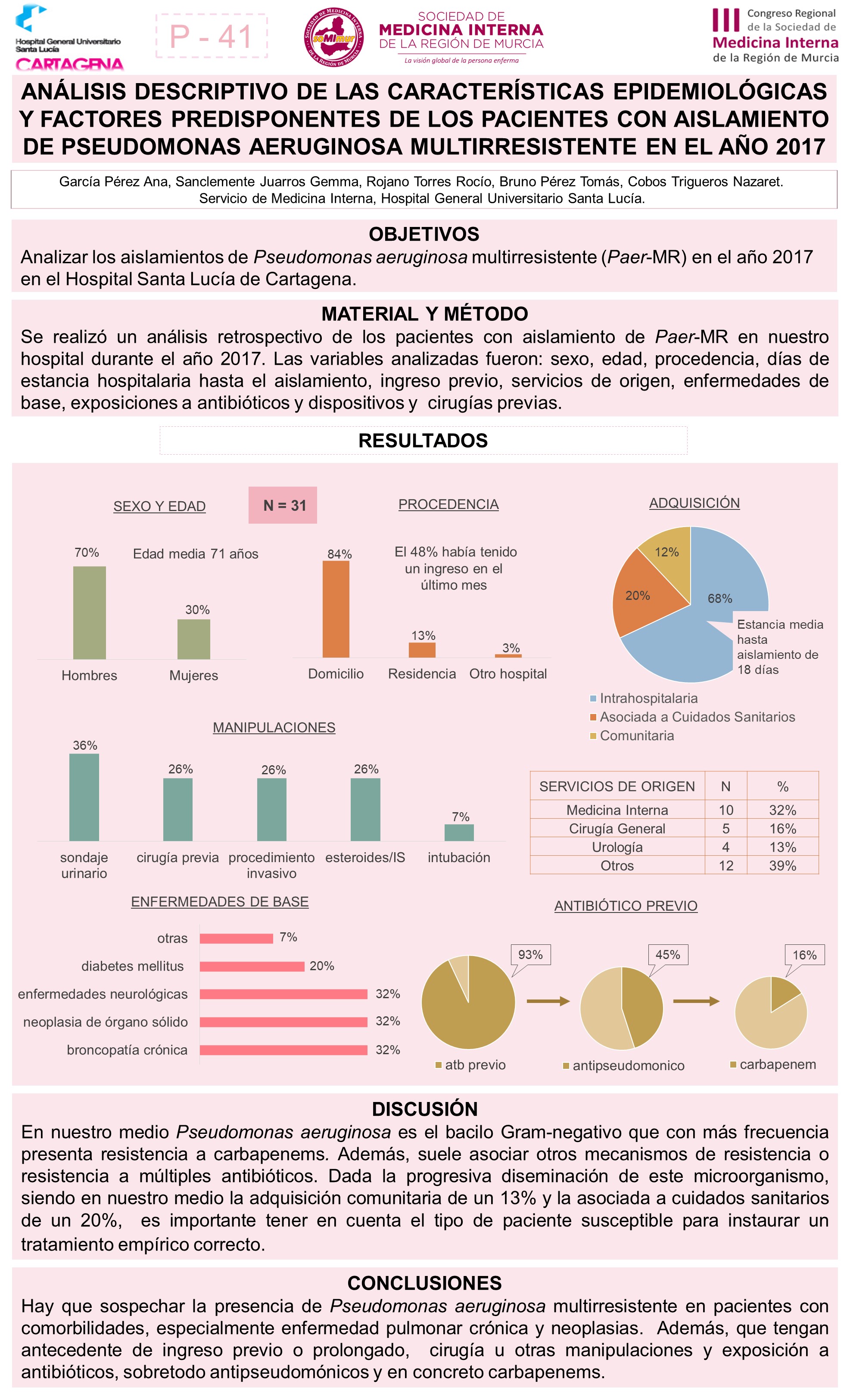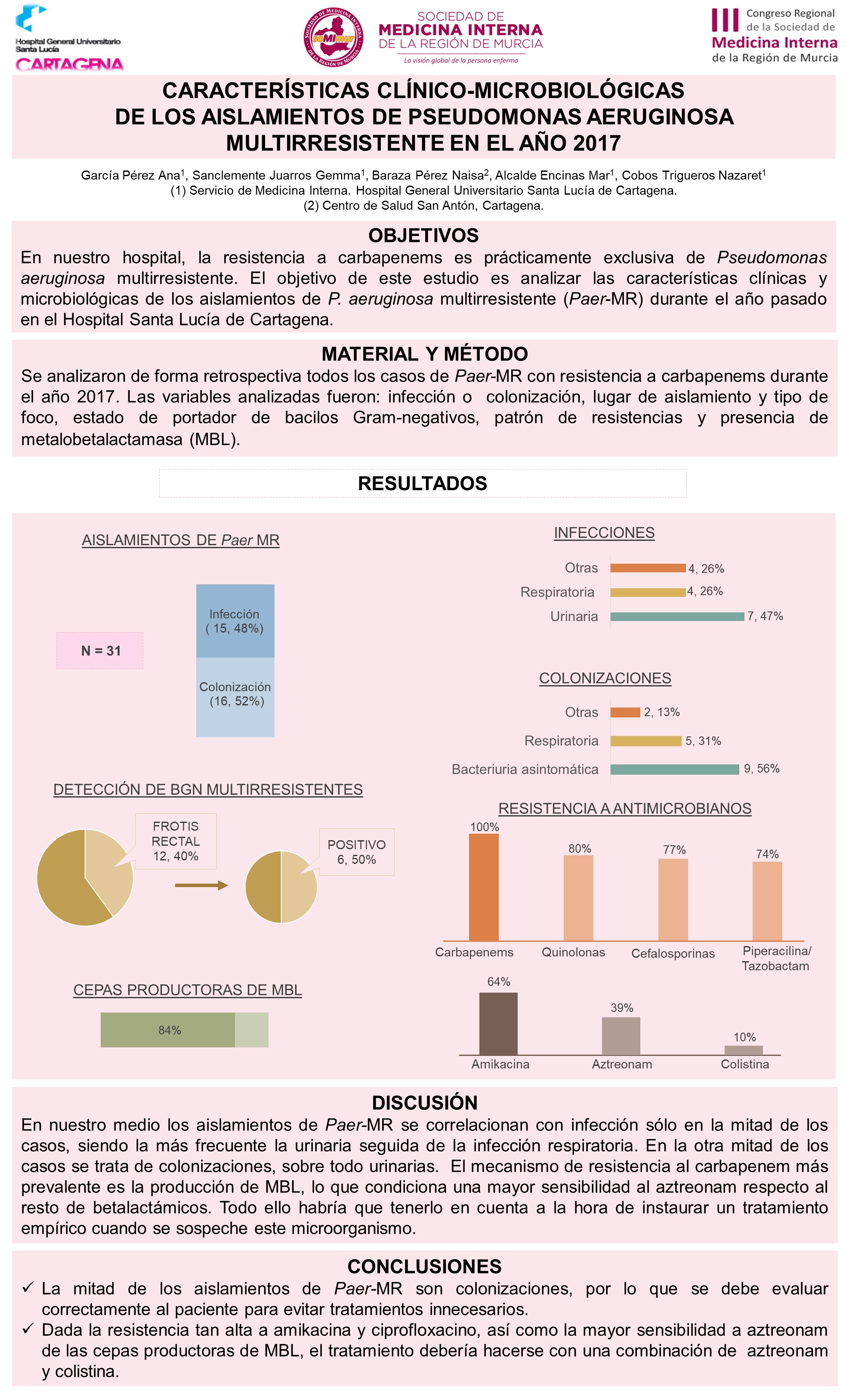 | P42 | Título: Características clínico-microbiológicas de los aislamientos de Pseudomonas aeruginosa mutirresistente en el año 2017. Autores: A. García Pérez; G. Sanclemente Juarros; N. Beraza Pérez; M. Alcalde Encinas; N. Cobos Trigueros. |