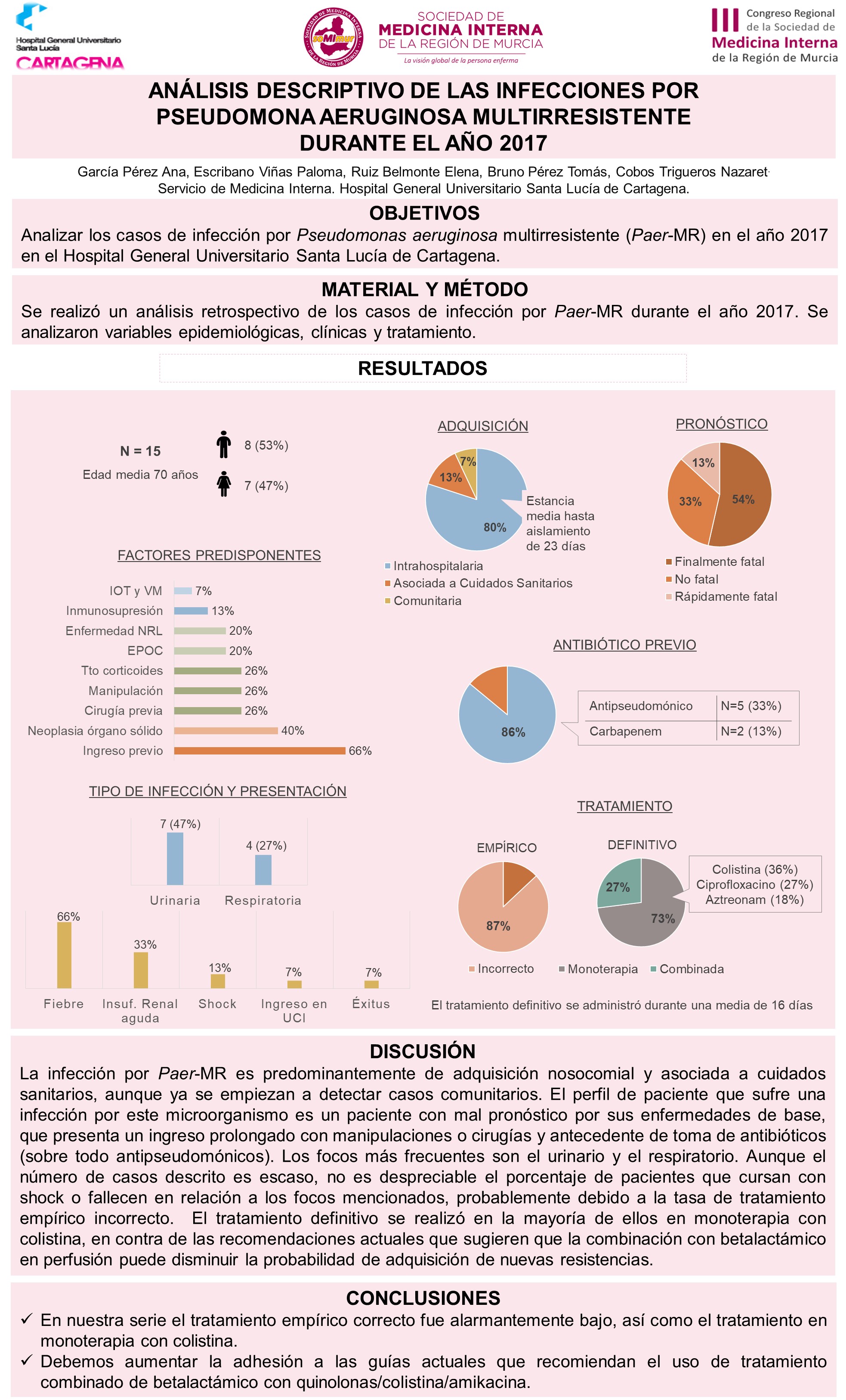 | P43 | Título: Análisis descriptivo de las infecciones por Pseudomonas aeruginosa multirresistente durante el año 2017. Autores: A. García Pérez; P. Escribano Viñas; E. Ruiz Belmonte; T. Bruno Pérez; N. Cobos Trigueros. |