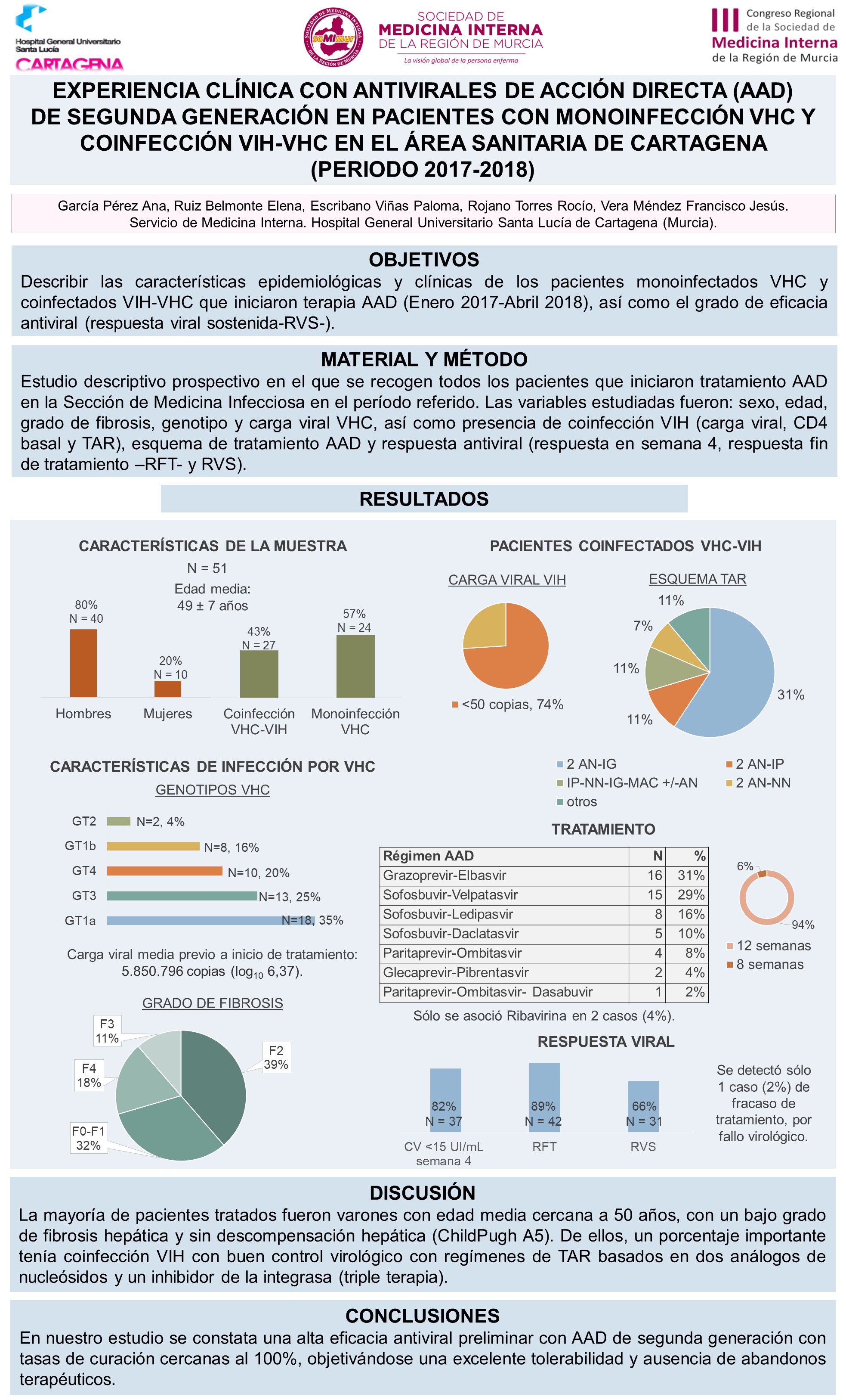 | P44 | Título: Experiencia clínica con antivirales de acción directa (AAD) de segunda generación en pacientes con monoinfección VHC y coinfección VIH-VHC en el área sanitaria de Cartagena (periodo 2017-2018). Autores: A. García Pérez; E. Ruiz Belmonte; P. Escribano Viñas; R. Rojano Torres; F.J. Vera Méndez. |