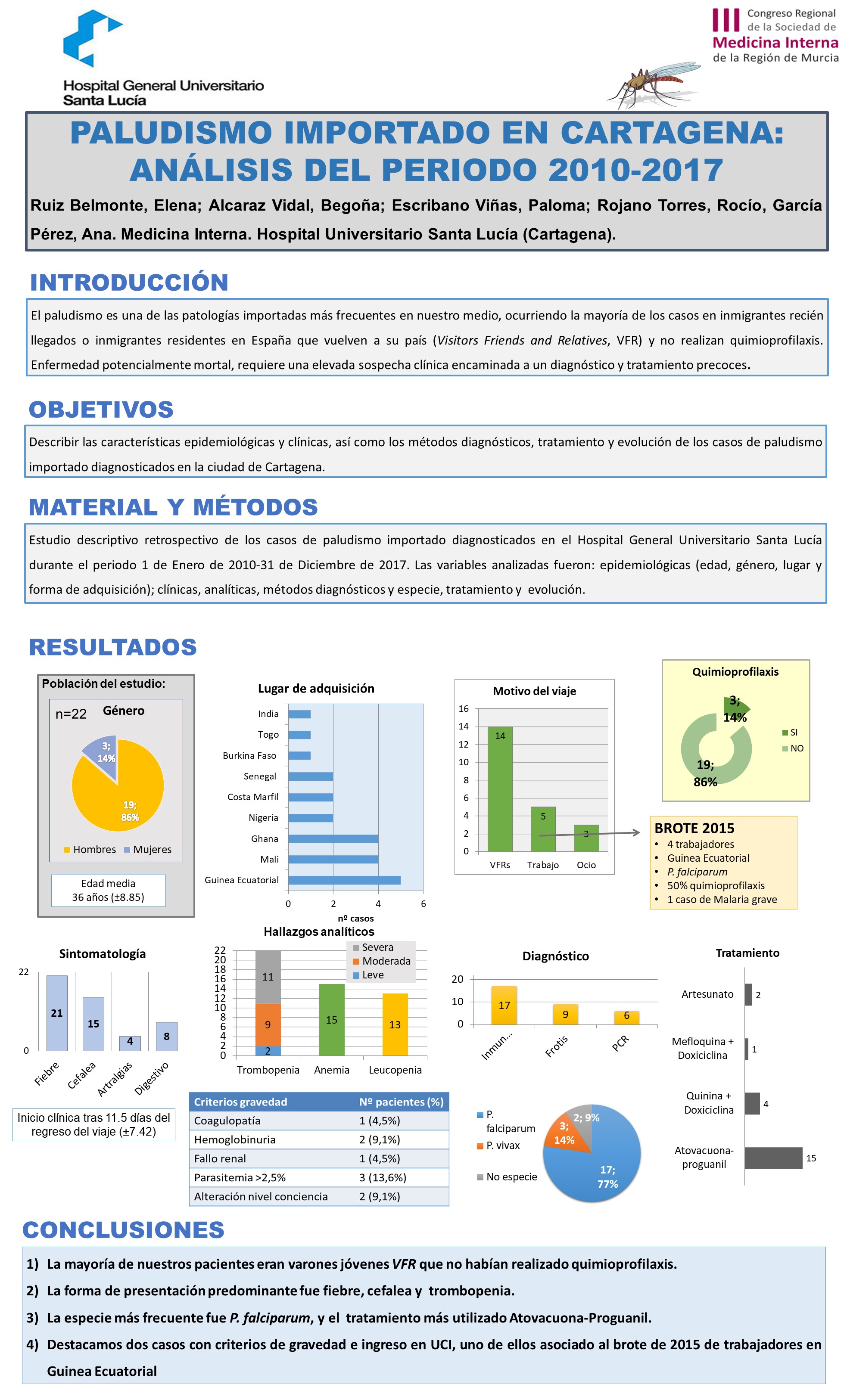 | P45 | Título: Paludismo importado en Cartagena: análisis del periodo 2010-2017. Autores: E. Ruiz Belmonte; B. Alcaraz Vidal; P. Escribano Viñas; R. Rojano Torres; A. García Pérez. |