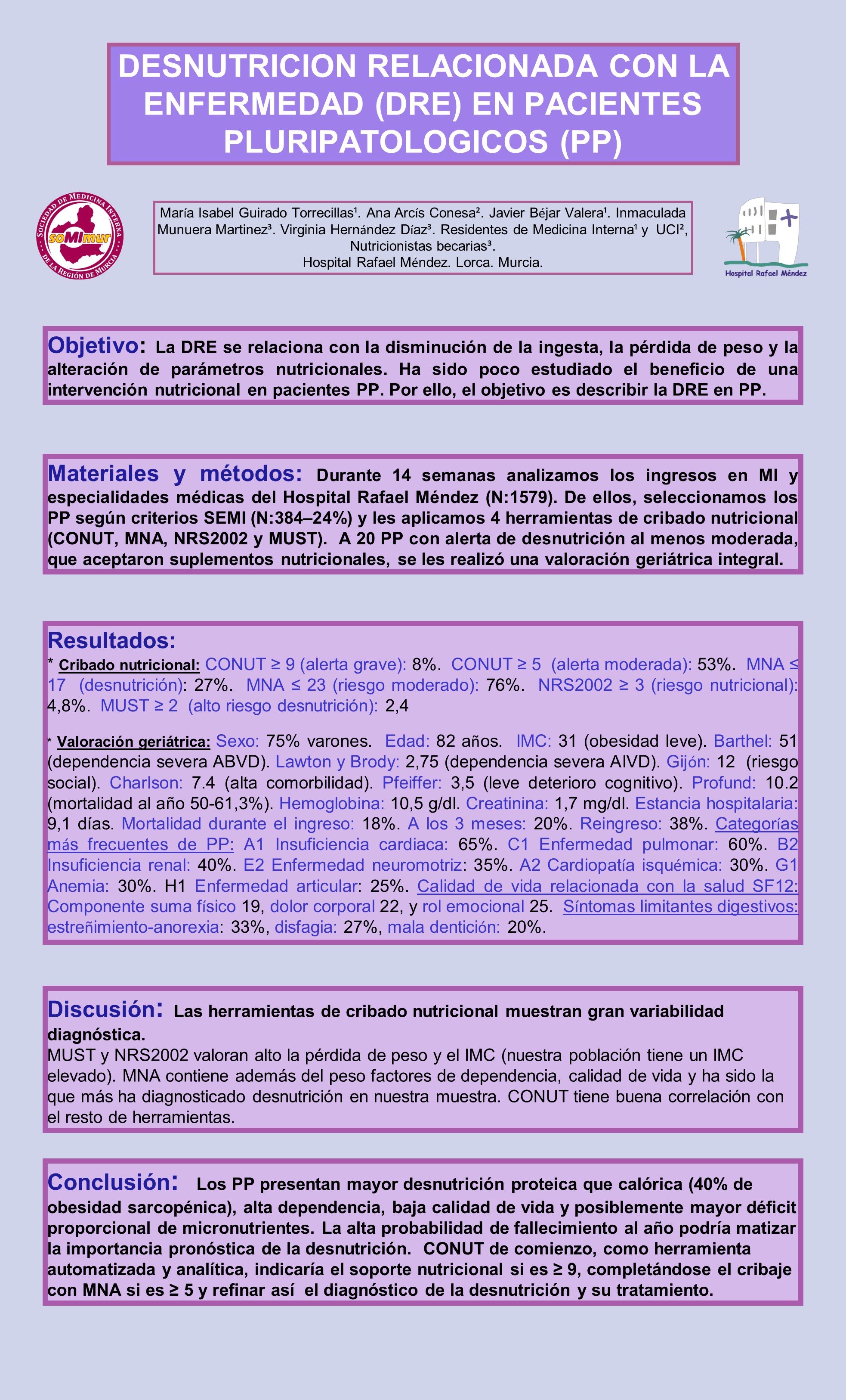 | P46 | Título: Desnutrición relacionada con la enfermedad en pacientes pluripatológicos. Autores: M.I. Guirado Torrecillas; A. Arcís Conesa; J. Béjar Valera; I. Munuera Martínez; V. Hernández Díaz. |