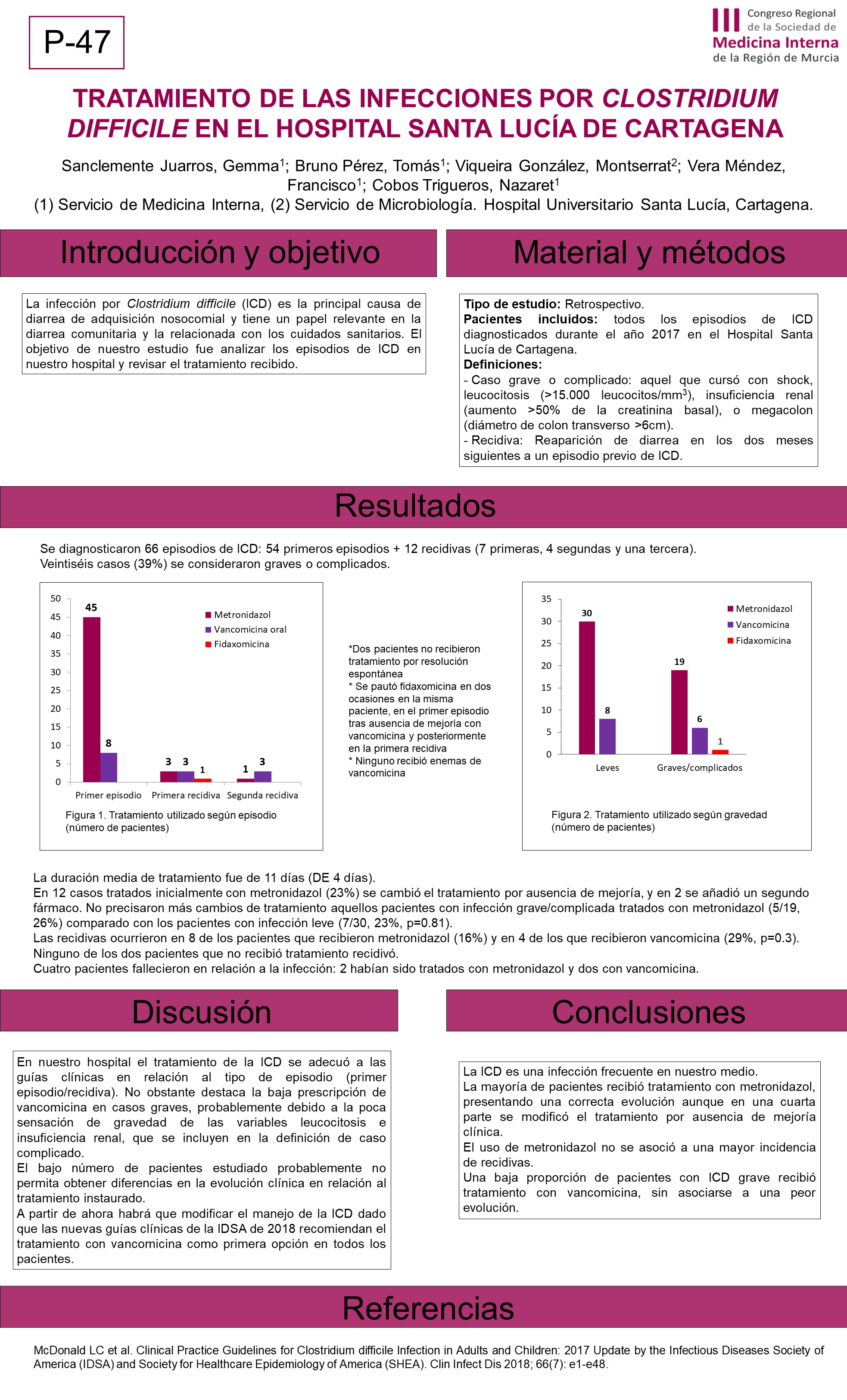 | P47 | Título: Tratamiento de las infecciones por Clostridium difficilie en el Hospital Santa Lucía de Cartagena. Autores: G. Sanclemente Juarros; T. Bruno Pérez; M. Viqueira González; F. Vera Méndez; N. Cobos Trigueros. |