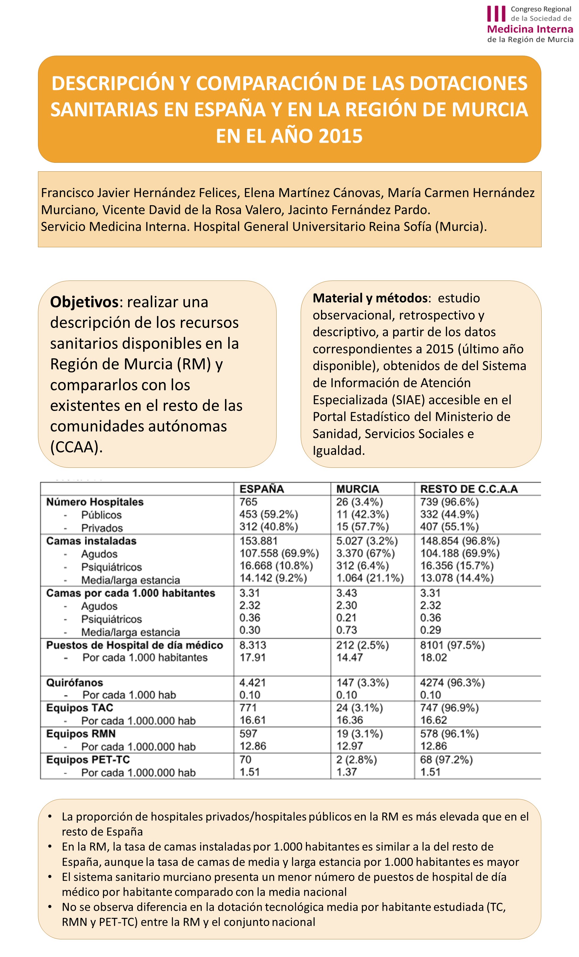 | P48 | Título: Descripción y comparación de las dotaciones sanitarias en España y en la Región de Murcia en el año 2015. Autores: F.J. Hernández Felices; E. Martínez Cánovas; M.C. Hernández Murciano; V.D. de la Rosa Valero; J. Fernández Pardo. |