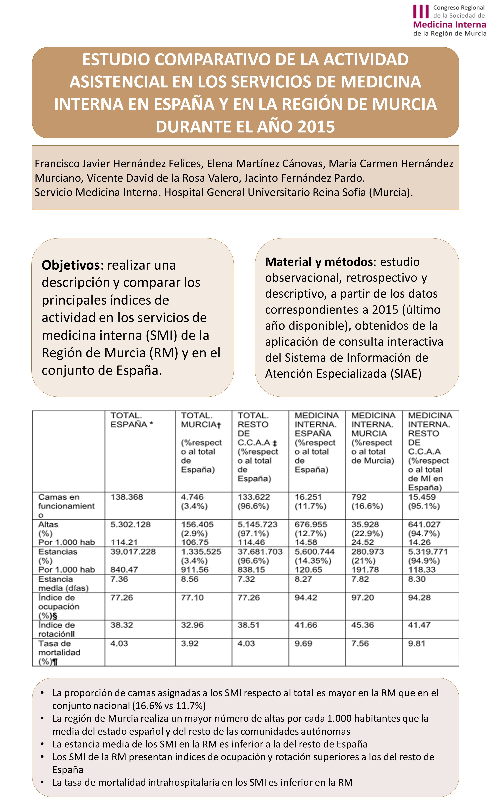 | P49 | Título: Estudio comparativo de la actividad asistencial en los servicios de Medicina Interna en España y en la Región de Murcia durante el año 2015. Autores: F.J. Hernández Felices; E. Martínez Cánovas; M.C. Herández Murciano; V.D. de la Rosa Valero; J. Fernández Pardo. |