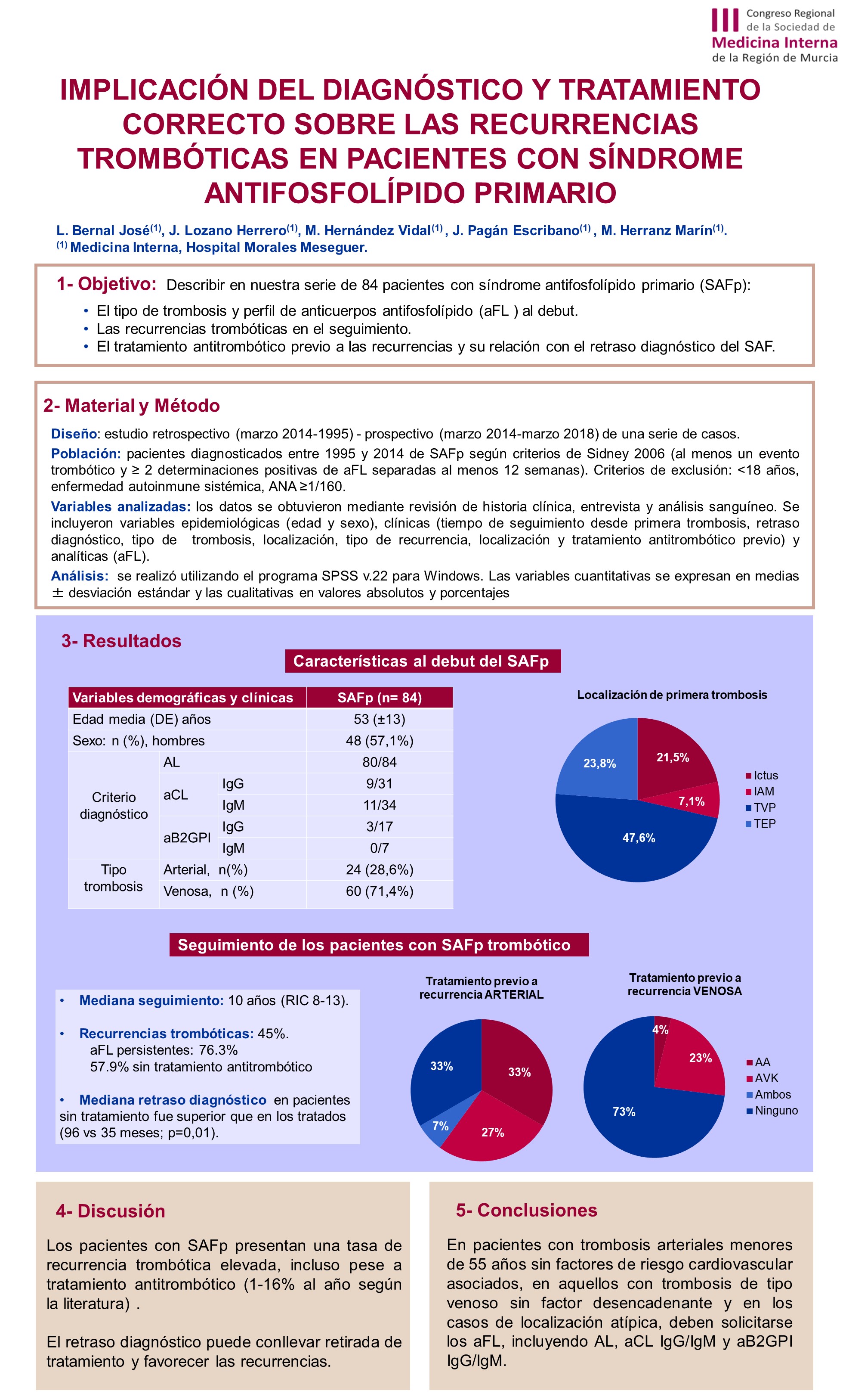 | P50 | Título: Implicación del diagnóstico y tratamiento correcto sobre las recurrencias trombóticas en pacientes con síndrome antifosfolípido primario. Autores: L. Bernal José; J. Lozano Herrero; M. Hernández Vidal; J. Pagán Escribano, M. Herranz Marín. |