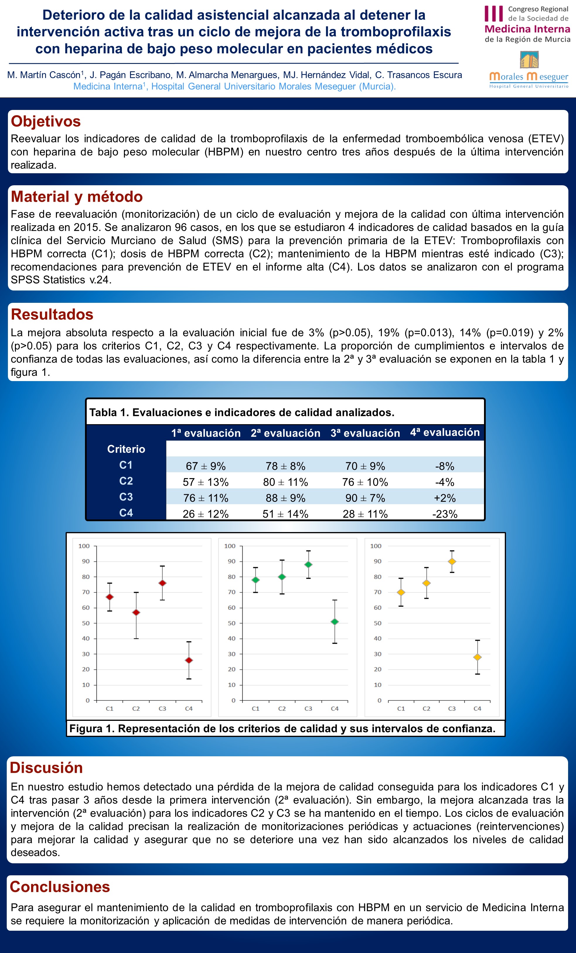 | P51 | Título: Deterioro de la calidad asistencial alcanzada al dentener la intervención activa tras un ciclo de mejora de la tromboprofilaxis con heparina de bajo peso molecular en pacientes médicos. Autores: M. Martín Cascón; J. Pagán Escribano; M. Almarcha Menargues; M.J. Hernández Vidal; C. Trasancos Escura. |