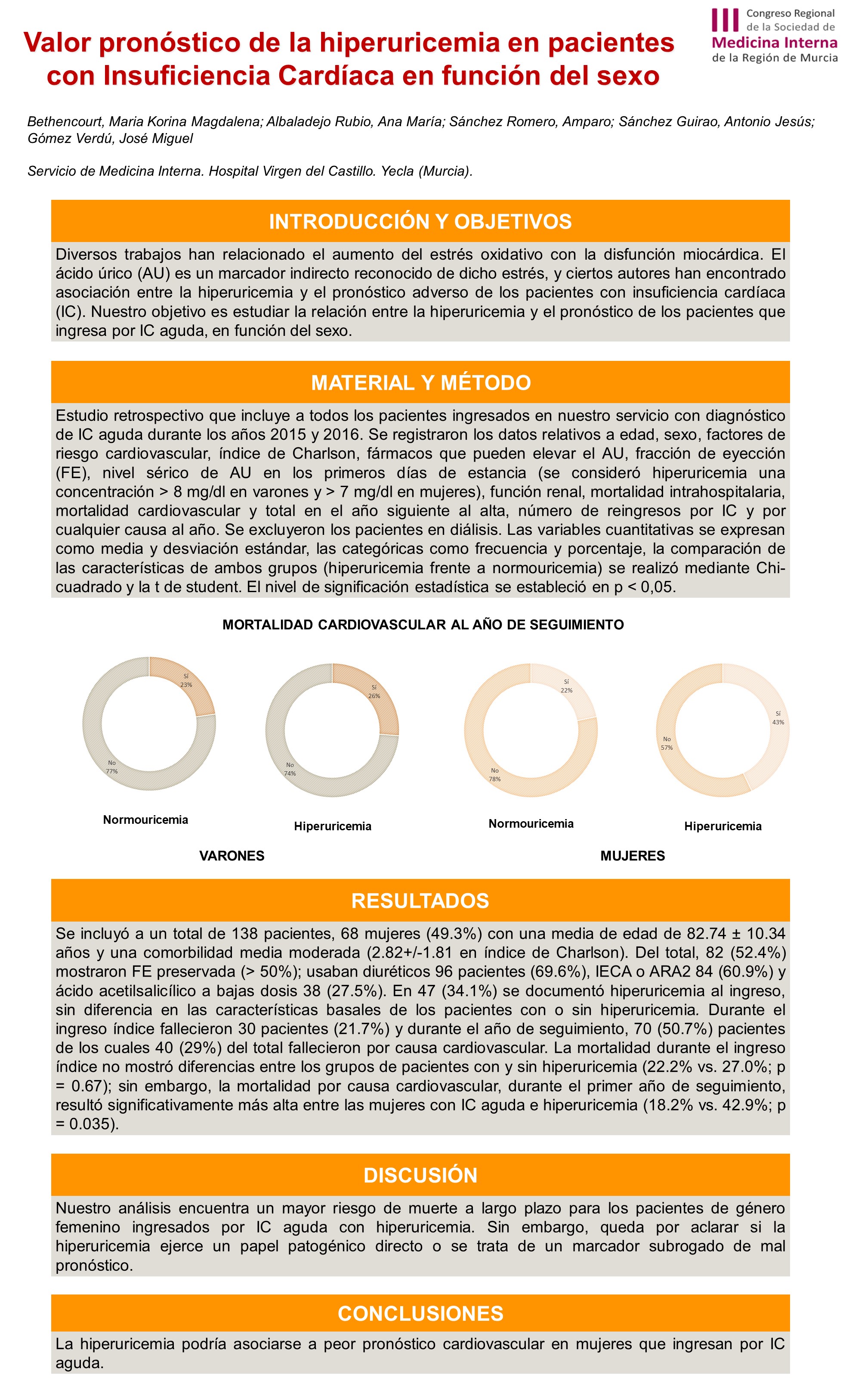 | P52 | Título: Valor pronóstico de la hiperuricemia en pacientes con insuficiencia cardiaca en función del sexo. Autores: M.K.M. Bethencourt; A.M. Albaladejo Rubio; A. Sánchez Romero; A.J. Sánchez Guirao; J.M. Gómez Verdú. |
