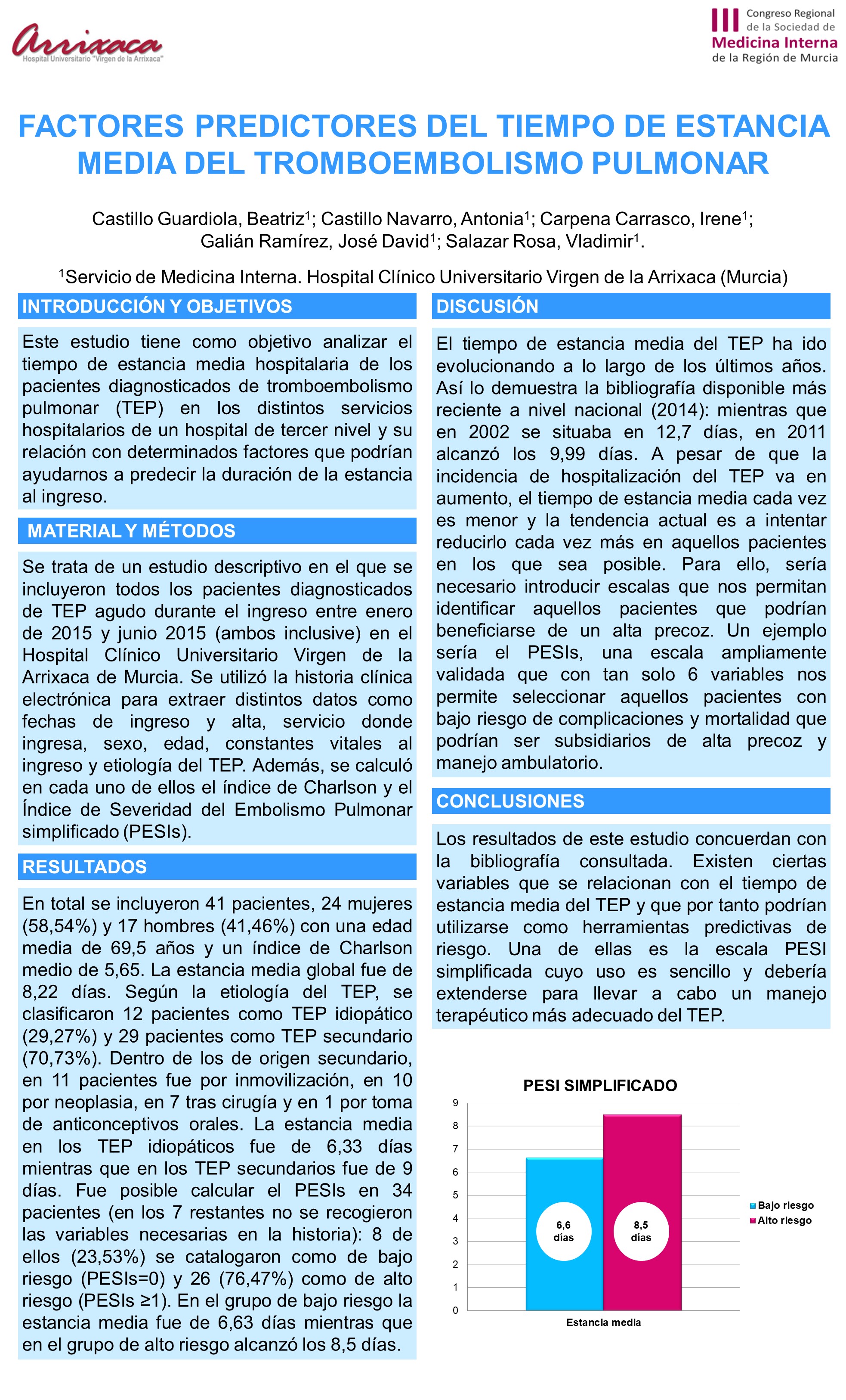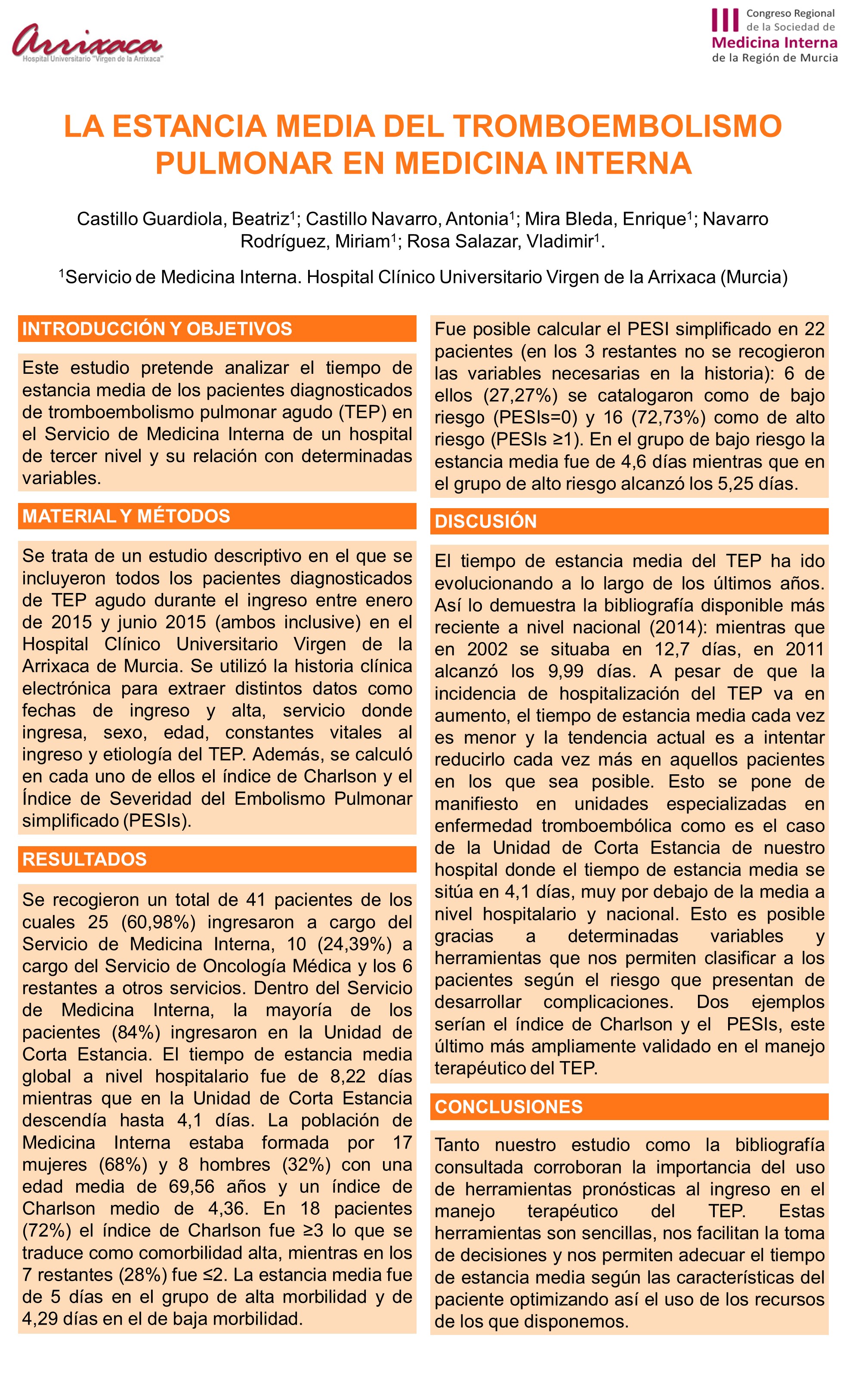 | P55 | Título: La estancia media del tromboembolismo pulmonar en Medicina Interna. Autores: B. Castillo Guardiola; A. Castillo Navarro; E. Mira Bleda; M. Navarro Rodríguez; V. Rosa Salazar. |