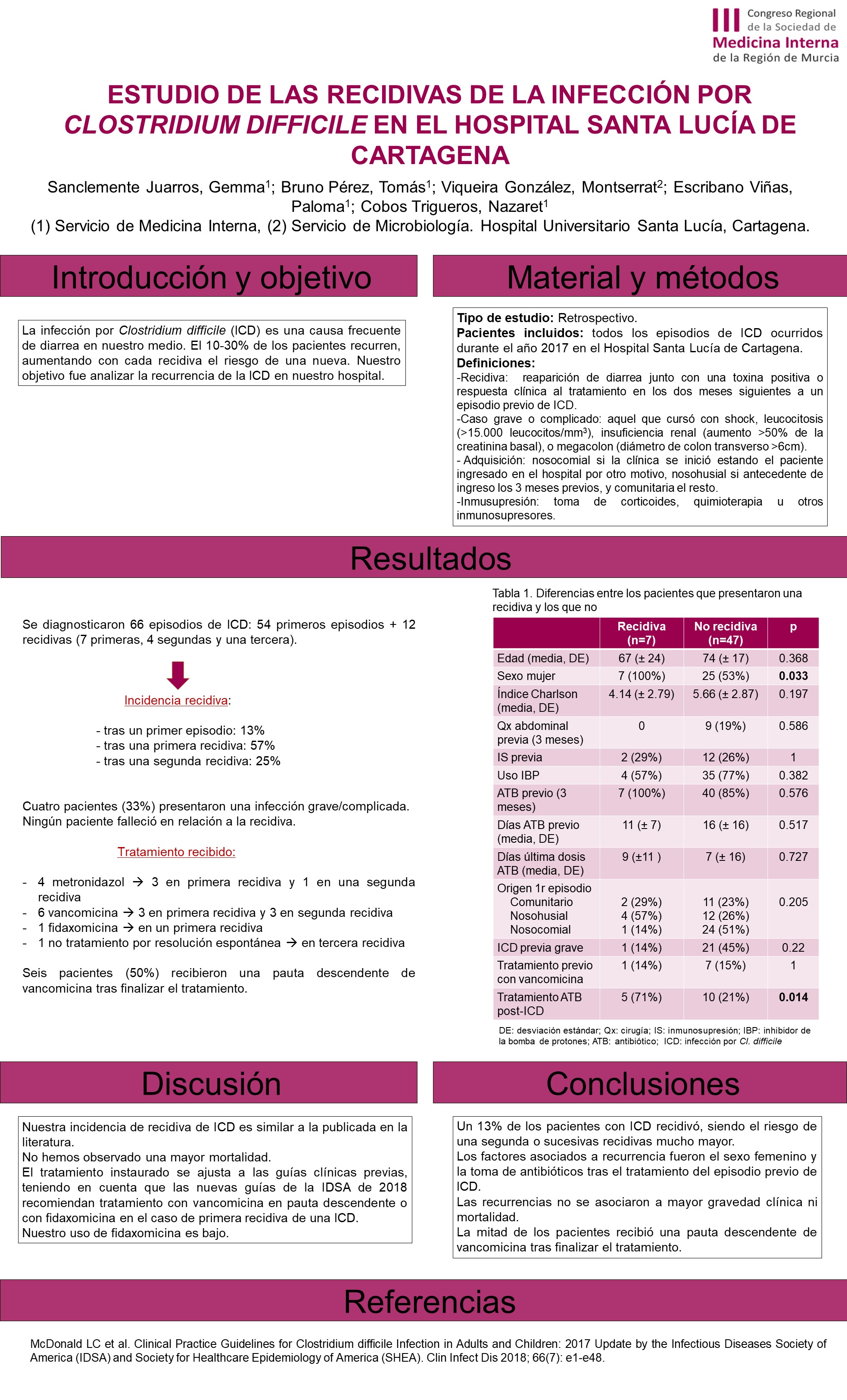 | P56 | Título: Estudio de las recidivas de la infección por Clostridium difficile en el Hospital Santa Lucía de Cartagena. Autores: G. Sanclemente Juarros; T. Bruno Pérez; M. Viqueira González; P. Escribano Viñas; N. Cobos Trigueros. |