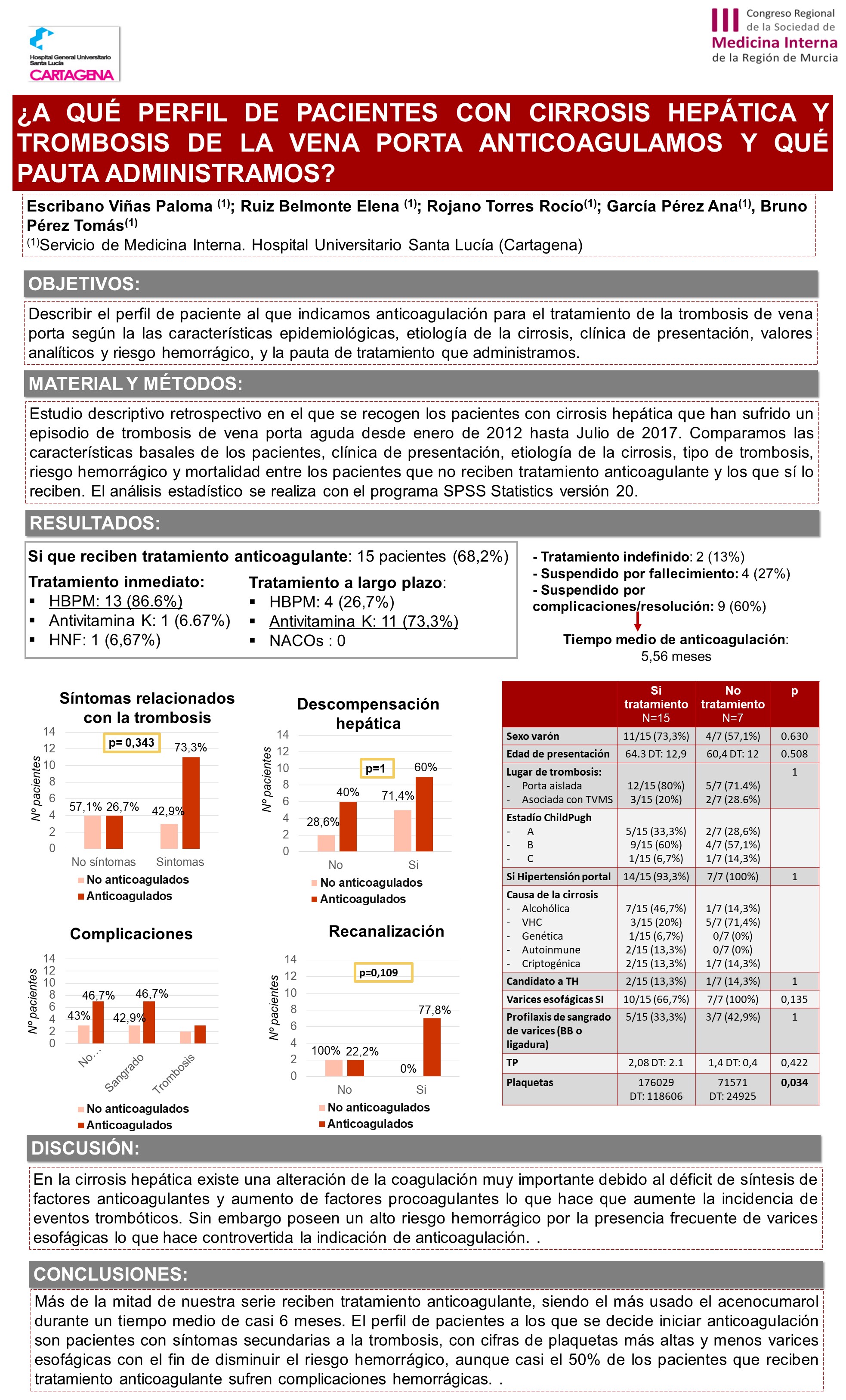 | P58 | Título: ¿A qué perfil de pacientes con criterios de cirrosis hepática y trombosis de la vena porta anticoagulamos y qué pauta administramos? Autores: P. Escribano Viñas; E. Ruiz Belmonte; R. Rojano Torres; A. García Pérez; B. Pérez Tomás. |