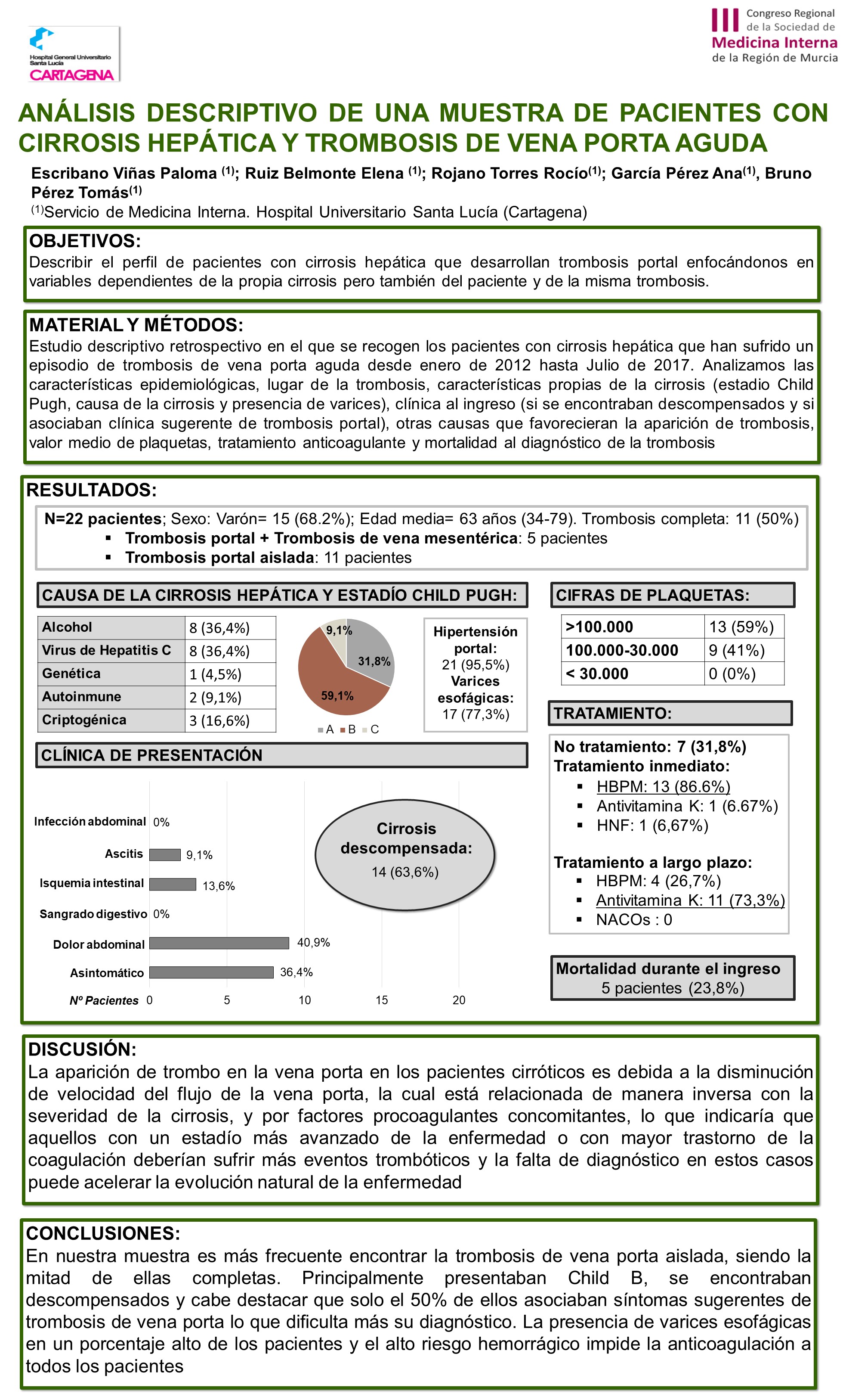 | P59 | Título: Análisis descriptivo de una muestra de pacientes con cirrosis hepática y trombosis de la vena porta aguda. Autores: P. Escribano Viñas; E. Ruiz Belmonte; R. Rojano Torres; A. García Pérez; B. Pérez Tomás. |