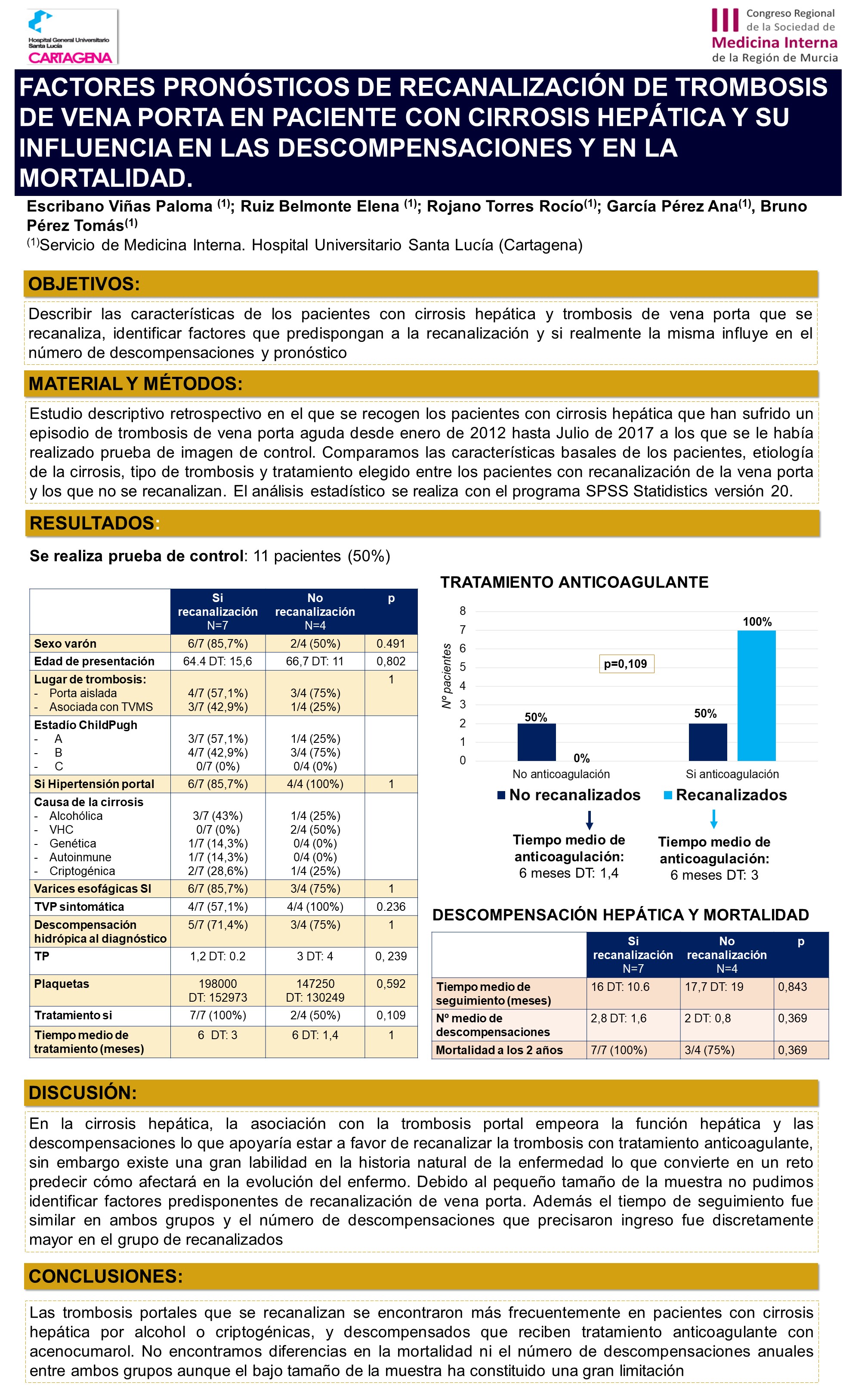 | P60 | Título: Factores pronósticos de recanalización de trombosis de veno porta en pacientes con cirrosis hepática y su influencia en las descompensaciones y en la mortalidad. Autores: P. Escribano Viñas; E. Ruiz Belmonte; R. Rojano Torres; A. García Pérez; B. Pérez Tomás. |