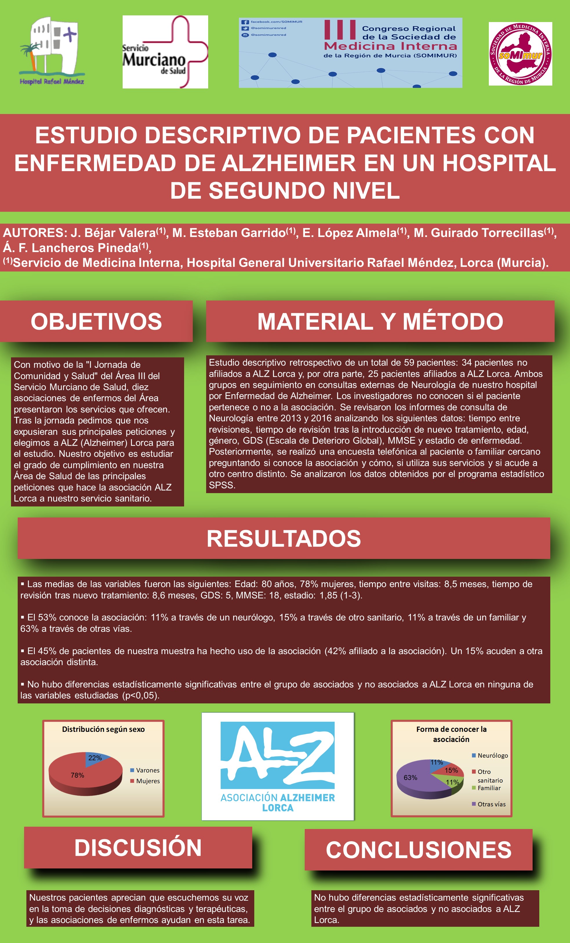 | P61 | Título: Estudio descriptivo de pacientes con enfermedad de Alzheimer en un hospital de segundo nivel. Autores: J. Béjar Valera; M. Esteban Garrido; E. López Almela; M. Guirado Torrecillas; A.F. Lancheros Pineda. |