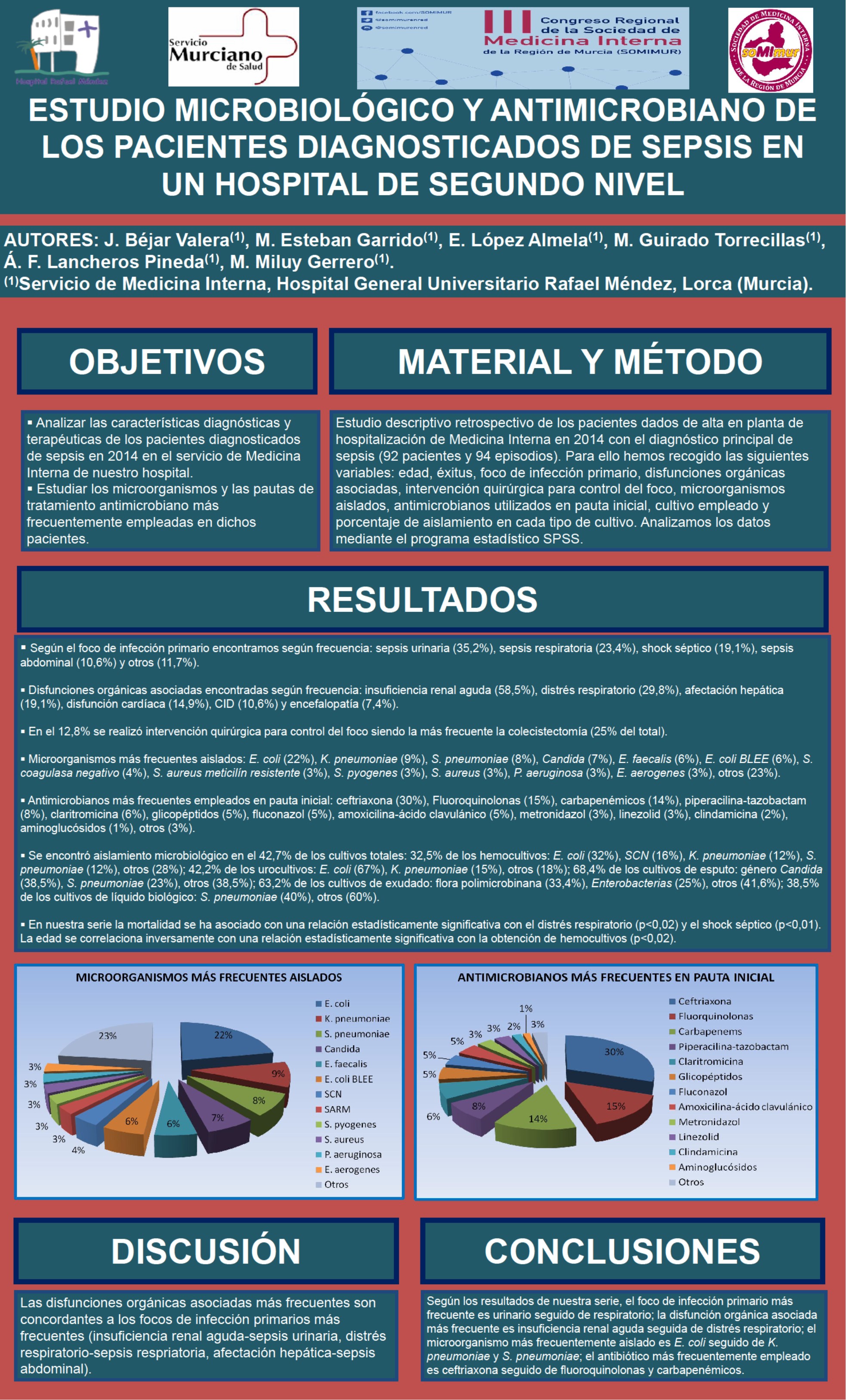 | P62 | Título: Estudio microbiológico y antimicrobiano de los pacientes diagnosticados de sepsis en un hospital de segundo nivel. Autores: J. Béjar Valera; M. Esteban Garrido; E. López Almela; M. Guirado Torrecillas; A.F. Lancheros Pineda; M. Miluy Guerrero. |