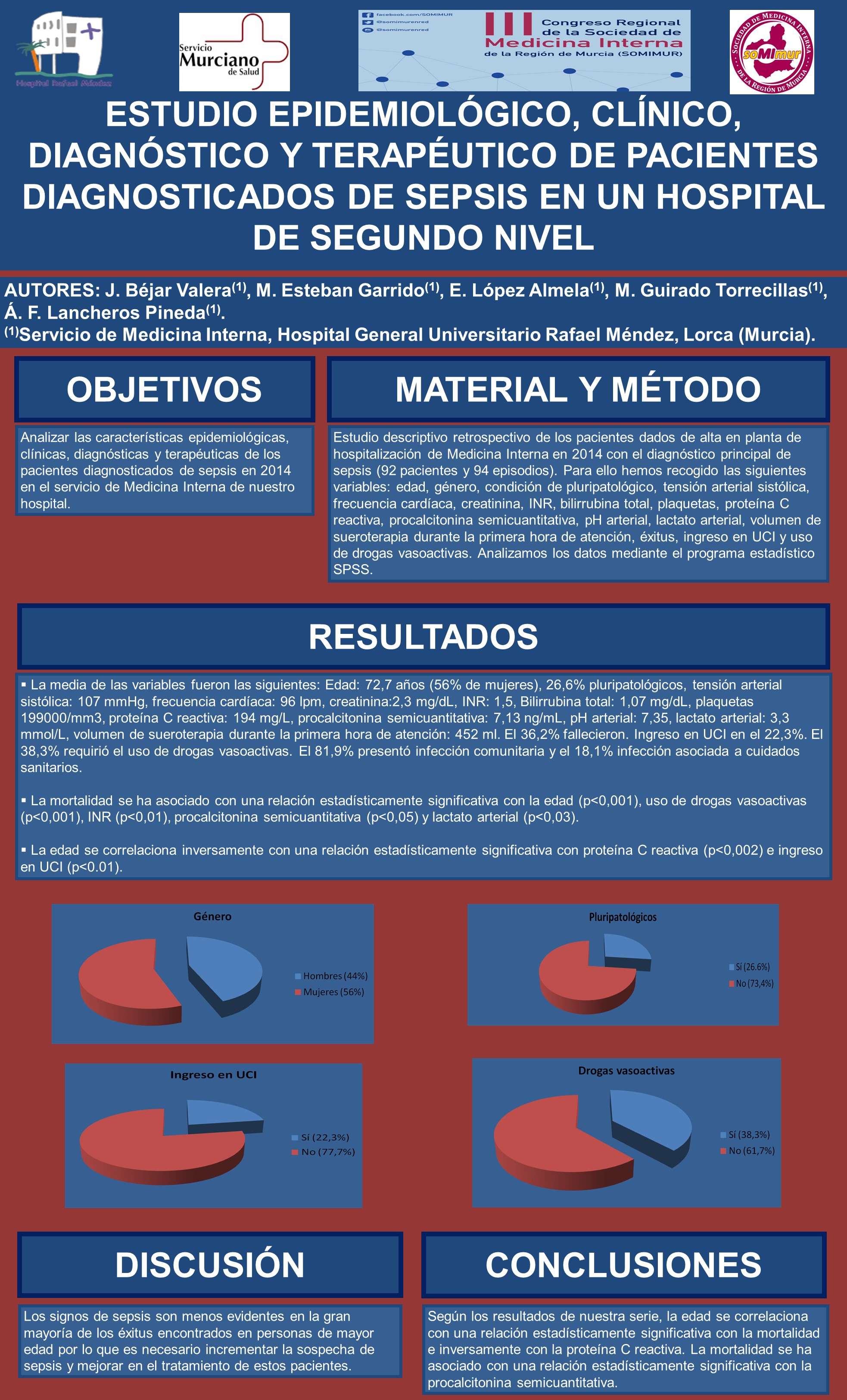 | P63 | Título: Estudio epidemiológico, clínico, diagnóstico y terapéutico de pacientes diagnosticados de sepsis en un hospital de segundo nivel. Autores: J. Béjar Valera; M. Esteban Garrido; E. López Almela; M. Guirado Torrecillas; A.F. Lancheros Pineda. |