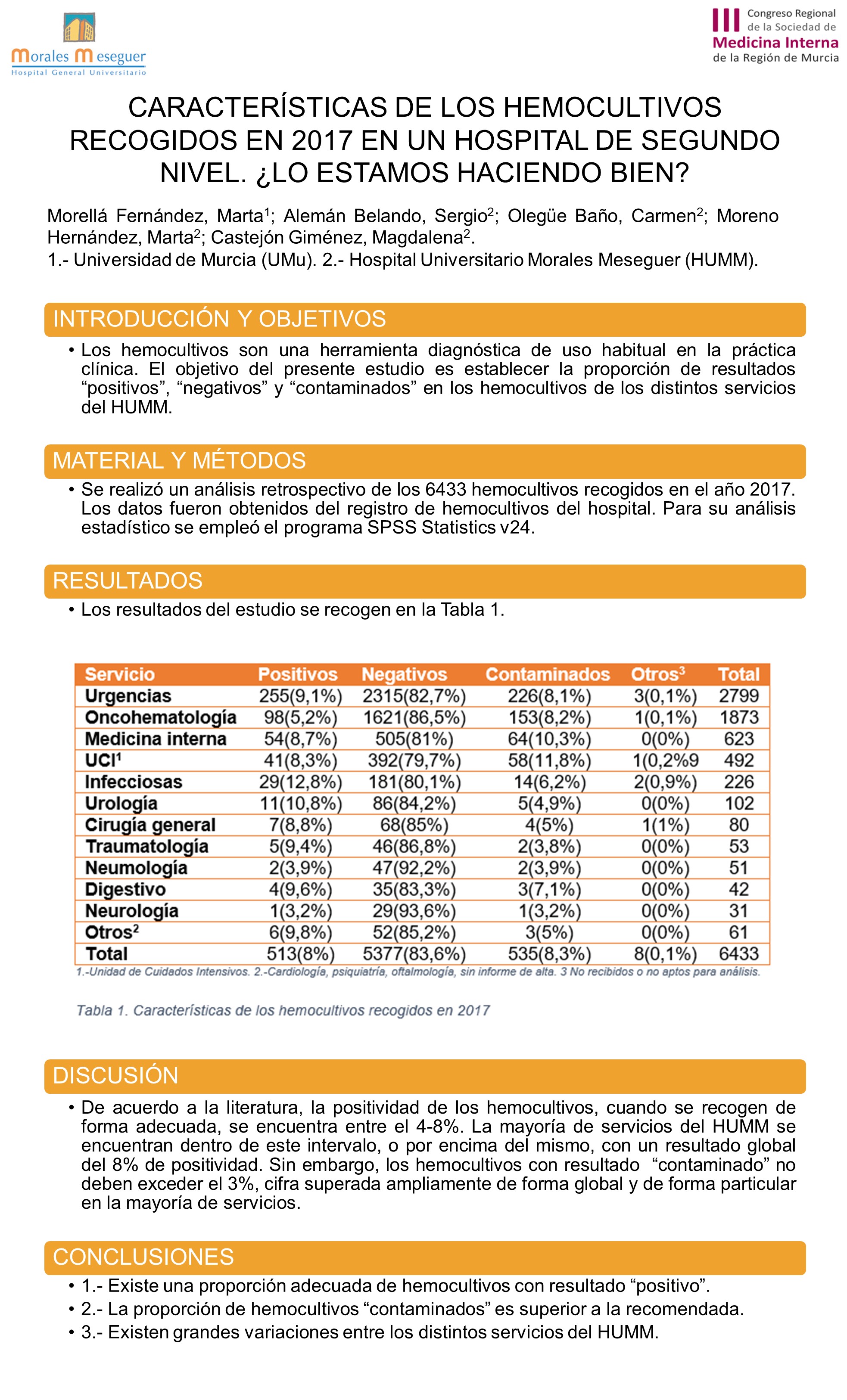 | P64 | Título: Características de los hemocultivos recogidos en 2017 en un hospital de segundo nivel. ¿Lo estamos haciendo bien? Autores: M. Morellá Fernández; S. Alemán Belando; C. Olagüe Baño; M. Moreno Hernández; M. Castejón Giménez. |