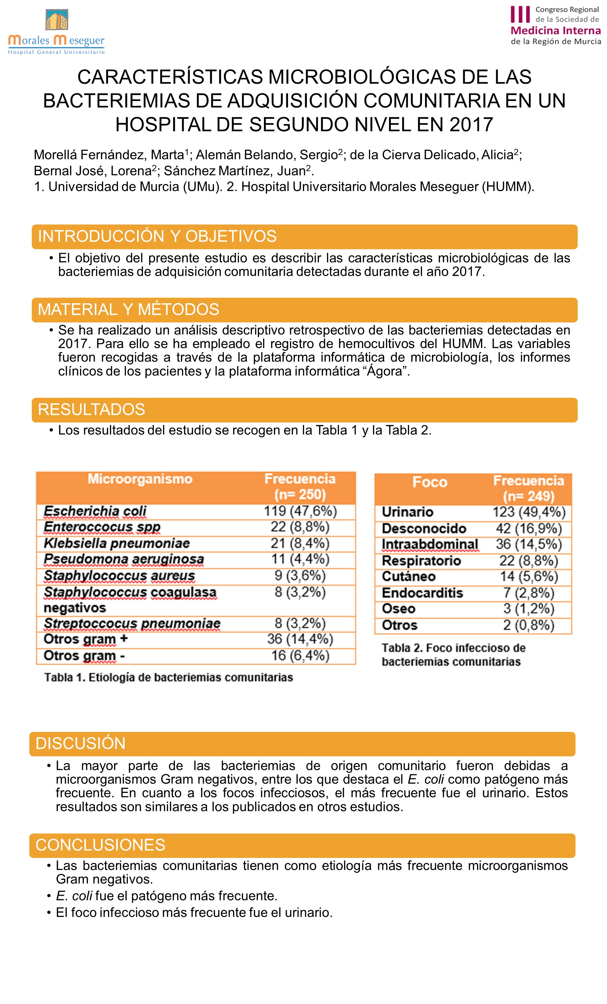 | P65 | Título: Características microbiológicas de las bacteriemias de adquisición comunitaria en un hospital de segundo nivel en 2017. Autores: M. Morella Fernández; S. Alemán Belando; A. de la Cierva Delicado; L. Bernal José; J. Sánchez Martínez. |